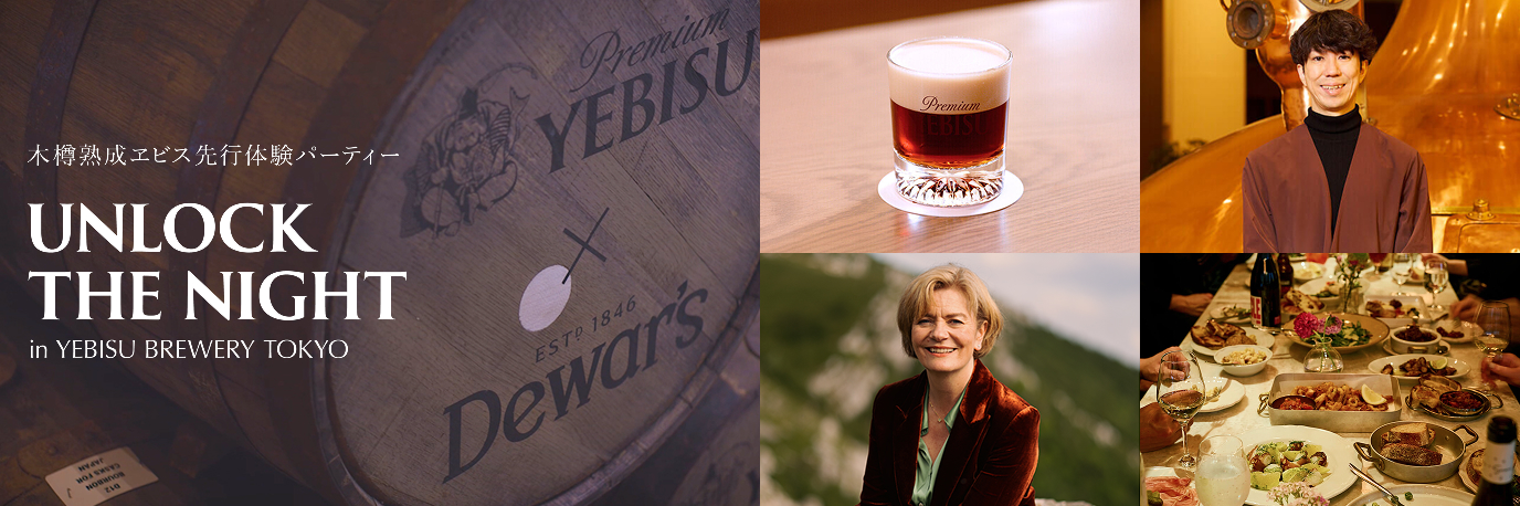 本イベントでは「Key of the Night」をデュワーズ12年の熟成に使われた木樽で寝かせた、スペシャルコラボレーションビール「Key of the Night -Barrel aged-」の味わいをいち早くご体験いただけます。さらにプレミアムな体験として、ヱビスブランドのChief Experience Brewer・有友亮太と、デュワーズのマスターブレンダー・ステファニー・マクラウド氏の特別対談を予定。加えて、恵比寿の人気店『Atelier LaLa』による厳選された料理の提供や、ヱビスのロゴをあしらったオリジナルバカラグラスで「Key of the Night -Barrel aged-」を楽しむ特別な体験で、参加者に特別な夜を演出いたします。