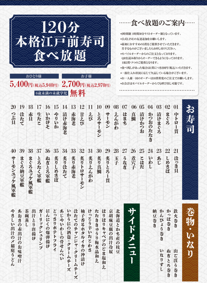 ・寿司食べ放題コースではお通し代は頂戴しておりません。