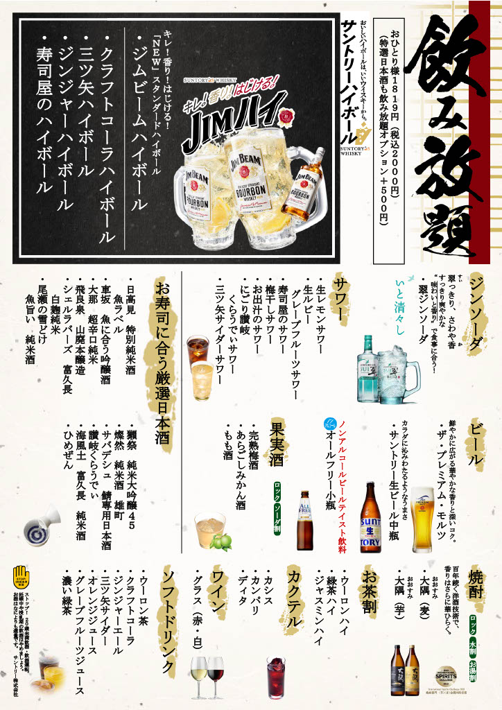 70種類の本格寿司、鶏唐揚げやポテトフライ、茶碗蒸しやうどん、そば、〆のデザートなど充実の食べ放題メニューに加え、人気銘柄の日本酒20種、神泡生ビールや頂点ハイボール、オリジナル涛司レモンサワー、人気の寿司屋のサワーなどを含んだ飲み放題も追加オプションでお楽しみいただけるプランとなっております。