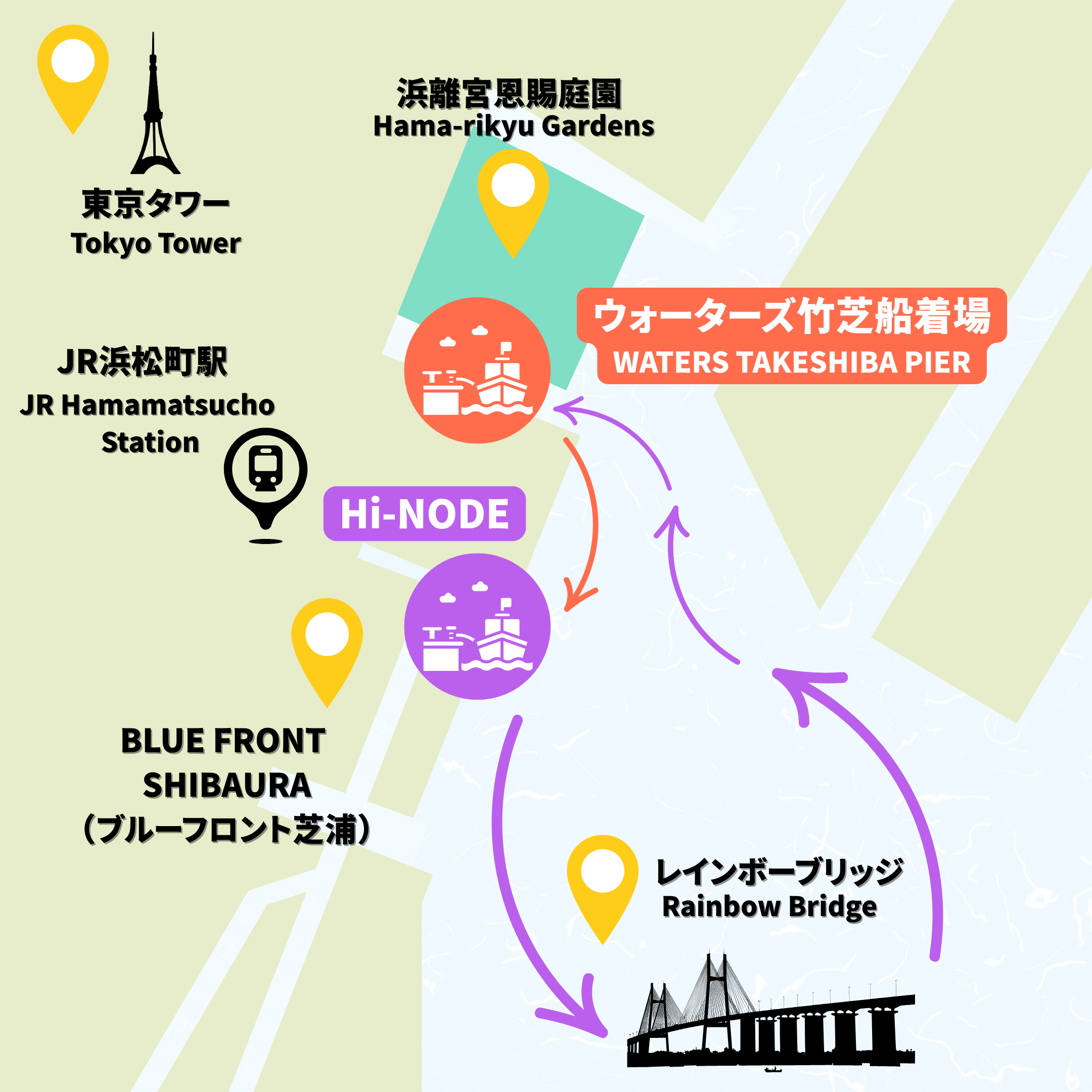 「ビールクルーズ東京ベイ」では、竹芝と芝浦(日の出)をオレンジと紫のルートで行き来するようにして運航いたします。