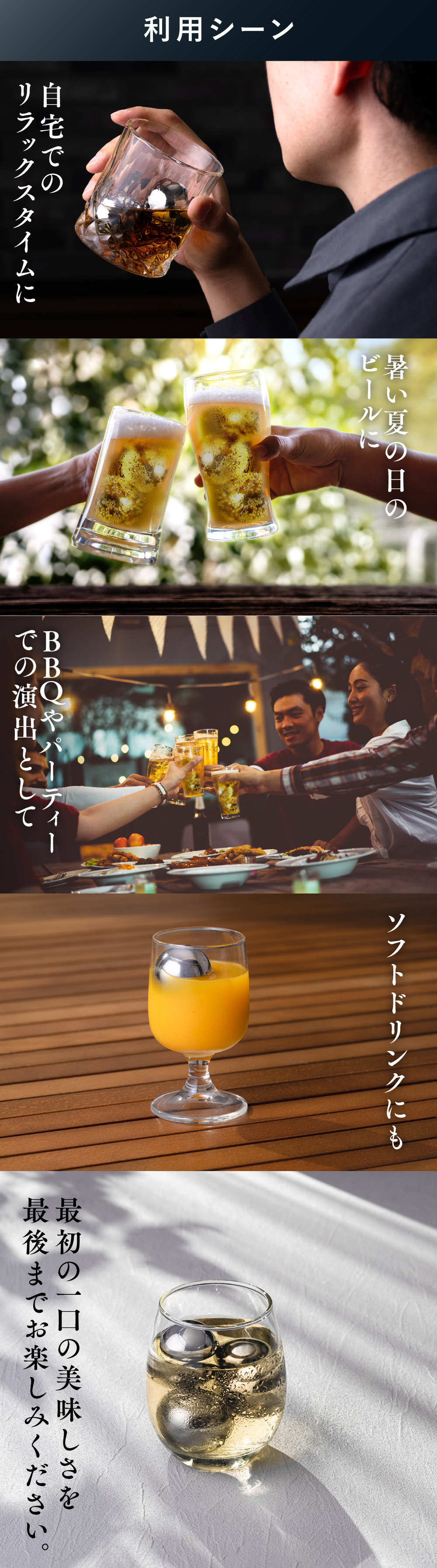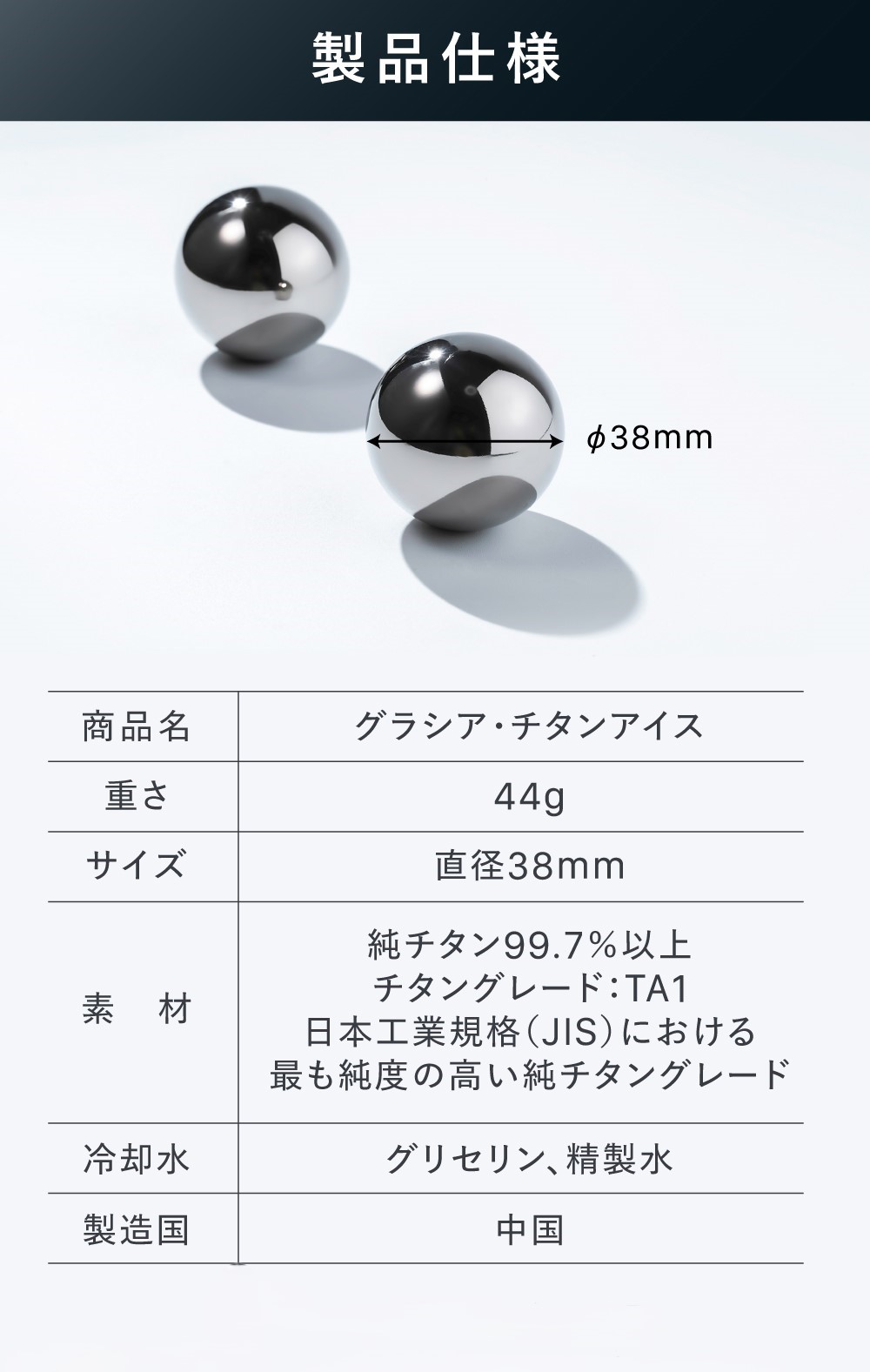 本製品は、職人の手により一つひとつ丁寧に磨き上げられた球体のチタンアイスです。まるで宝石のような光沢で、ドリンクタイムに華やかさと特別感を添えます。冷却性能と美しさを両立した、ギフトにも最適な逸品です。