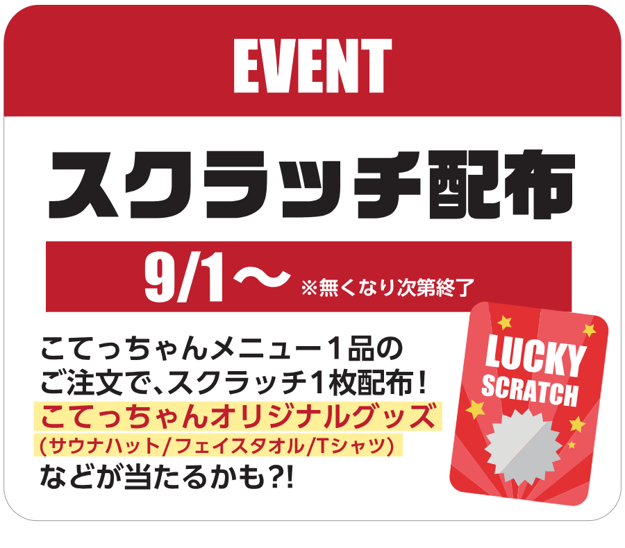 サウナハット/フェイスタオル/Tシャツなど「こてっちゃんオリジナルグッズ」がその場で当たるスクラッチを1枚配布!