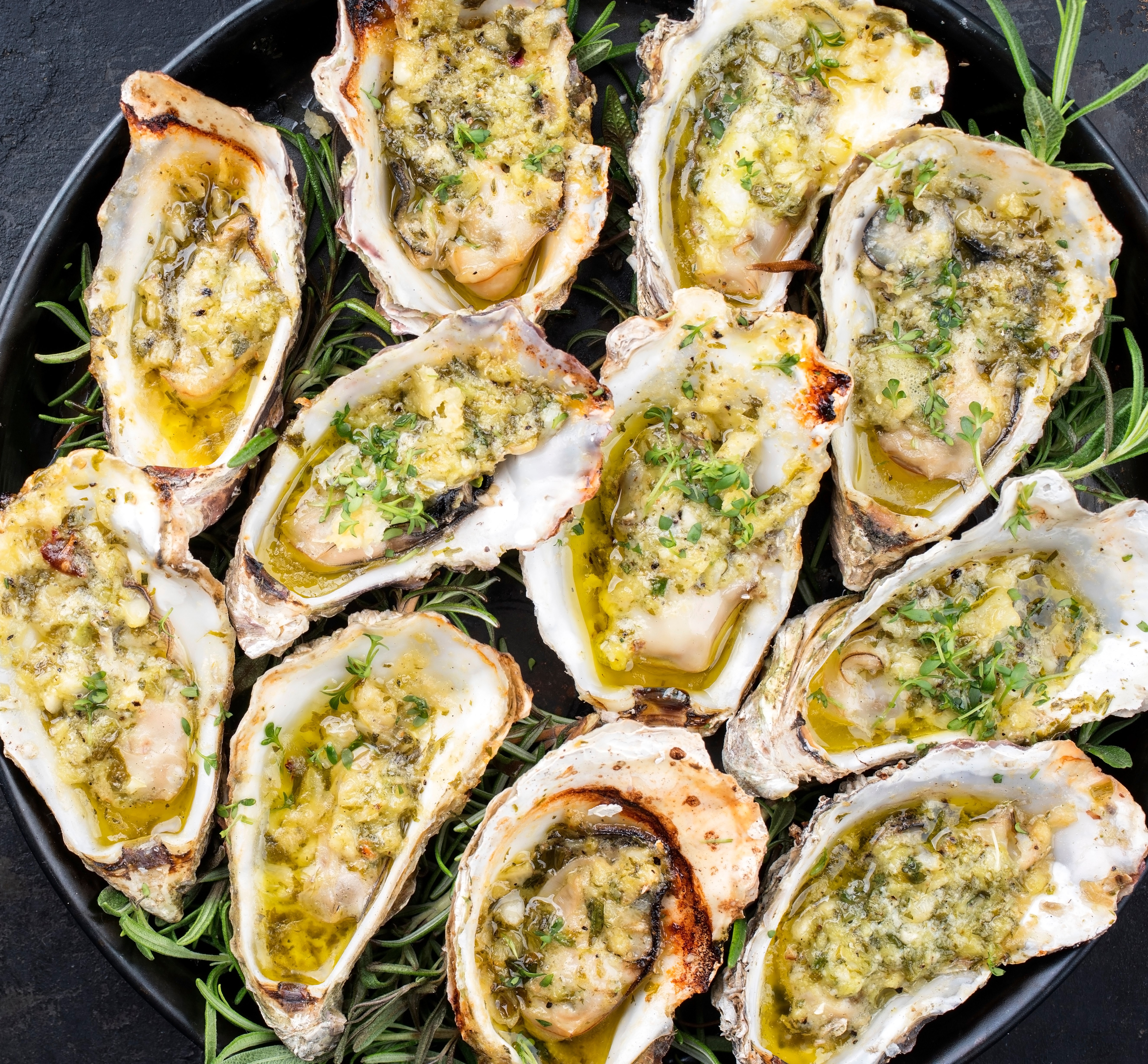 広島産牡蠣のオードブル盛り合わせ。チーズやガーリックソースなど多数味わえます。ビールとも相性抜群の殻付き牡蠣です。