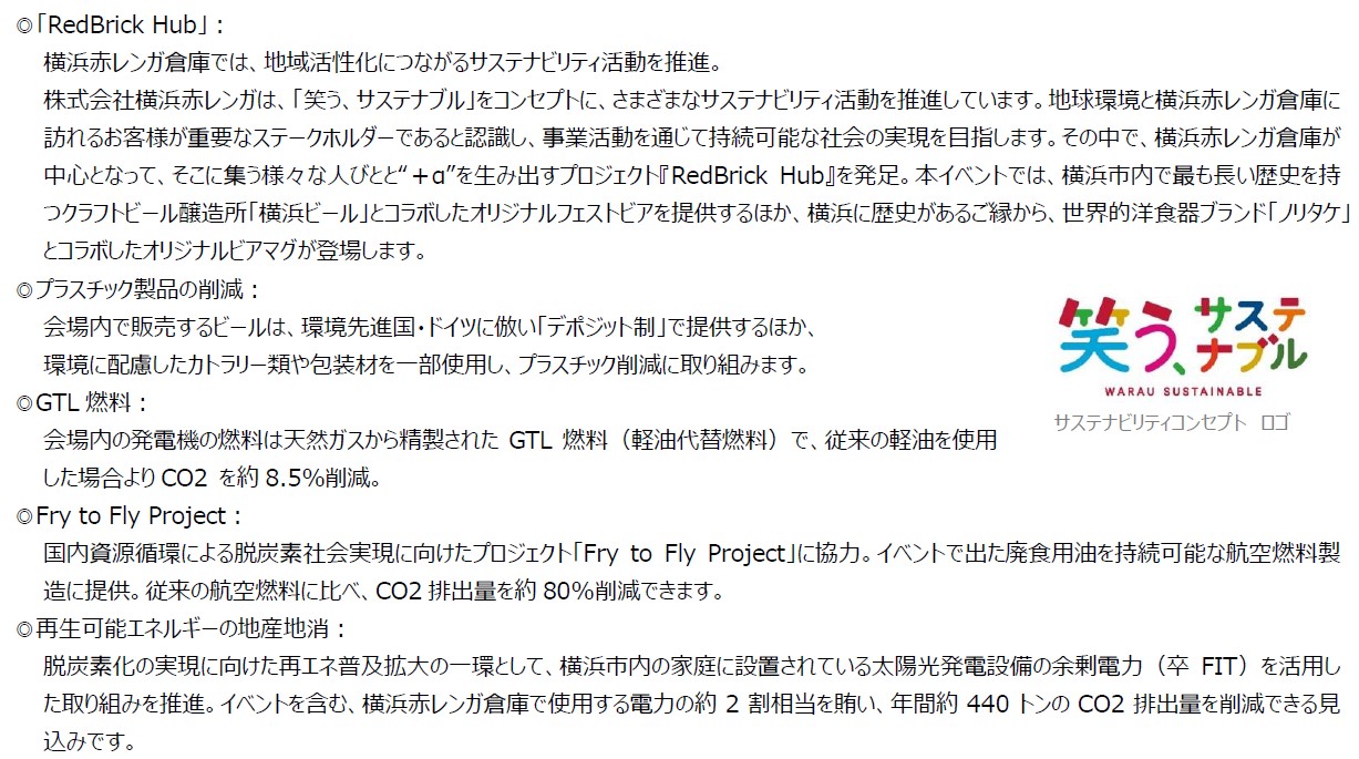 横浜赤レンガ倉庫の地域活性化につながるサステナビリティ活動『RedBrick Hub』施策として、横浜の老舗クラフトビール醸造所「横浜ビール」と本イベントに向け特別に開発したオリジナルビール「横浜オクトーバーフェストビア 〈ヘレス〉」が初登場。