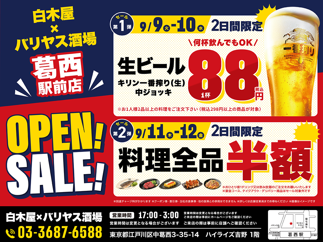 「白木屋×バリヤス酒場 葛西駅前店」オープンを記念したセール開催!