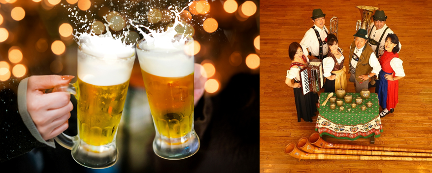 会場を一気に本場ドイツの雰囲気に変えるのが、毎日出演するアルプス音楽団。アコーディオンやトロンボーンなどのメロディーが響き渡り会場は本場ミュンヘンの雰囲気に!音楽に合わせてプロースト(乾杯)!