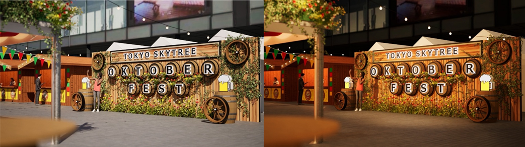 会場内には、オクトーバーフェストならではの雰囲気を楽しめるフォトスポットをご用意しています。ビール樽を組み合わせた「OKTOBER FEST」のサインは、まるでミュンヘンの街角に迷い込んだような華やかさ。昼間は青空とスカイツリーを背景に、夜はライトアップに包まれ、グラスを掲げて乾杯する姿を撮ったり、仲間と並んで記念撮影を楽しめます。