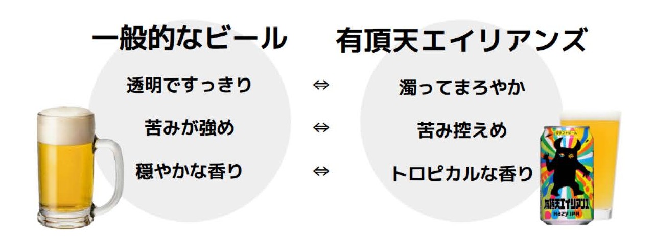 「有頂天エイリアンズ」のコンセプトは「搾りたてのフレッシュジュースのようなヘイジーIPAで、自由時間をぶちあげる」。日々の生活や一人時間の充実を大切にする人をターゲットに、毎日のタスクの終了を祝し、自由な一人時間の始まりを盛り上げてくれるようなビールを開発しました。気分の盛り上げを意味する「有頂天」をネーミングに使用したほか、彩り豊かなカラーリングではじける気分を表現しています。また、デザインやネーミングにエイリアンをあしらうことで、未知の味わいとの遭遇で得られるワクワク感を表しました。一人時間を充実させたい方にはもちろん、気分をぶち上げ、解放感に浸りたい全ての人におすすめのビールです。