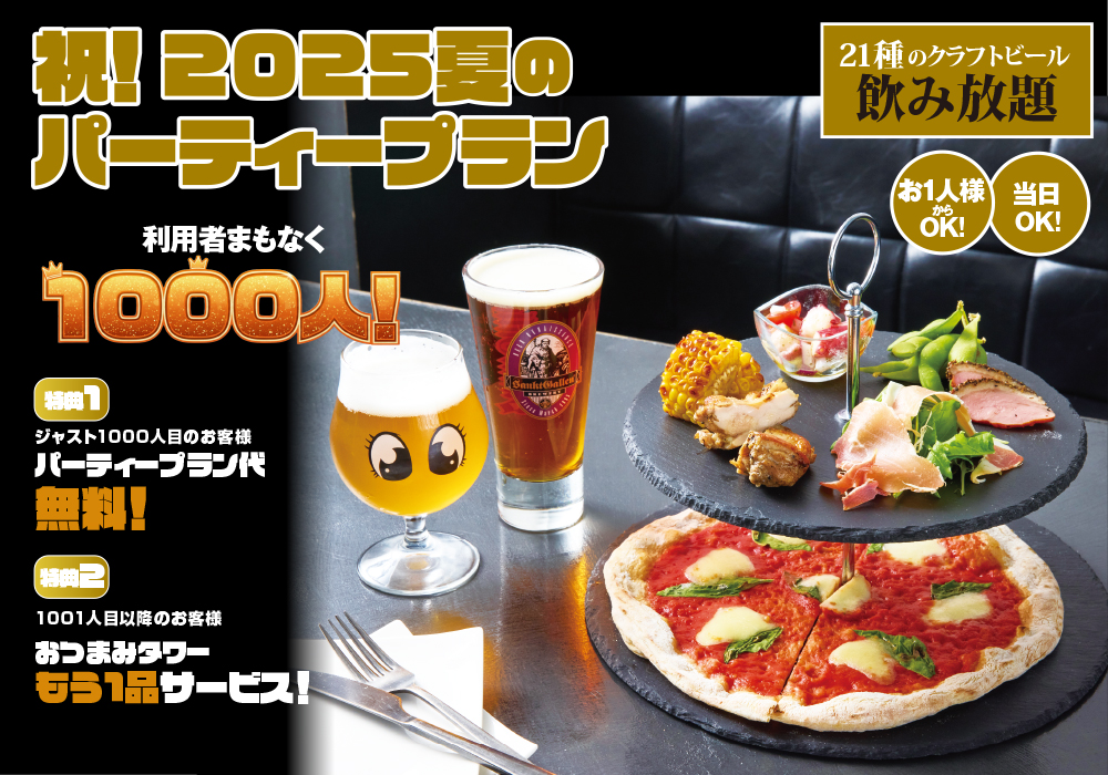 ちょうど1000人目のご利用となったお客様は、パーティープラン代を無料といたします。