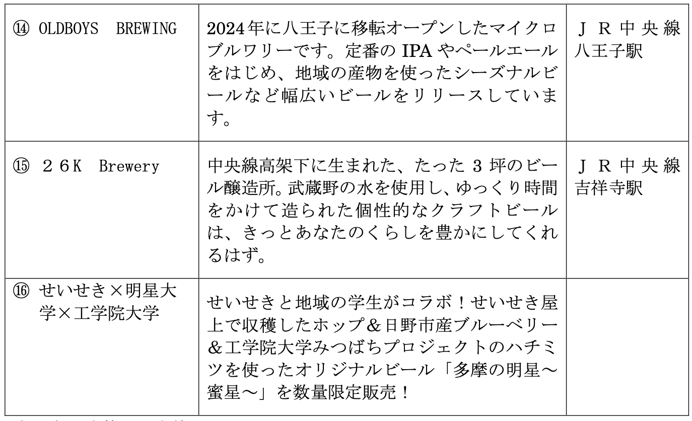 京王線沿線や多摩を代表する16ブルワリーがせいせきに集合!