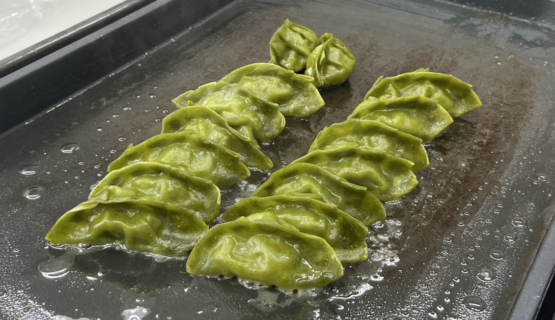 多摩大学松本ゼミとわさび食堂が共同開発した奥多摩産わさびパウダーを練り込んだ皮で、奥多摩産わさびの葉と茎を入れた餡を包んだ「わさび焼き餃子」を本イベント限定で販売します。