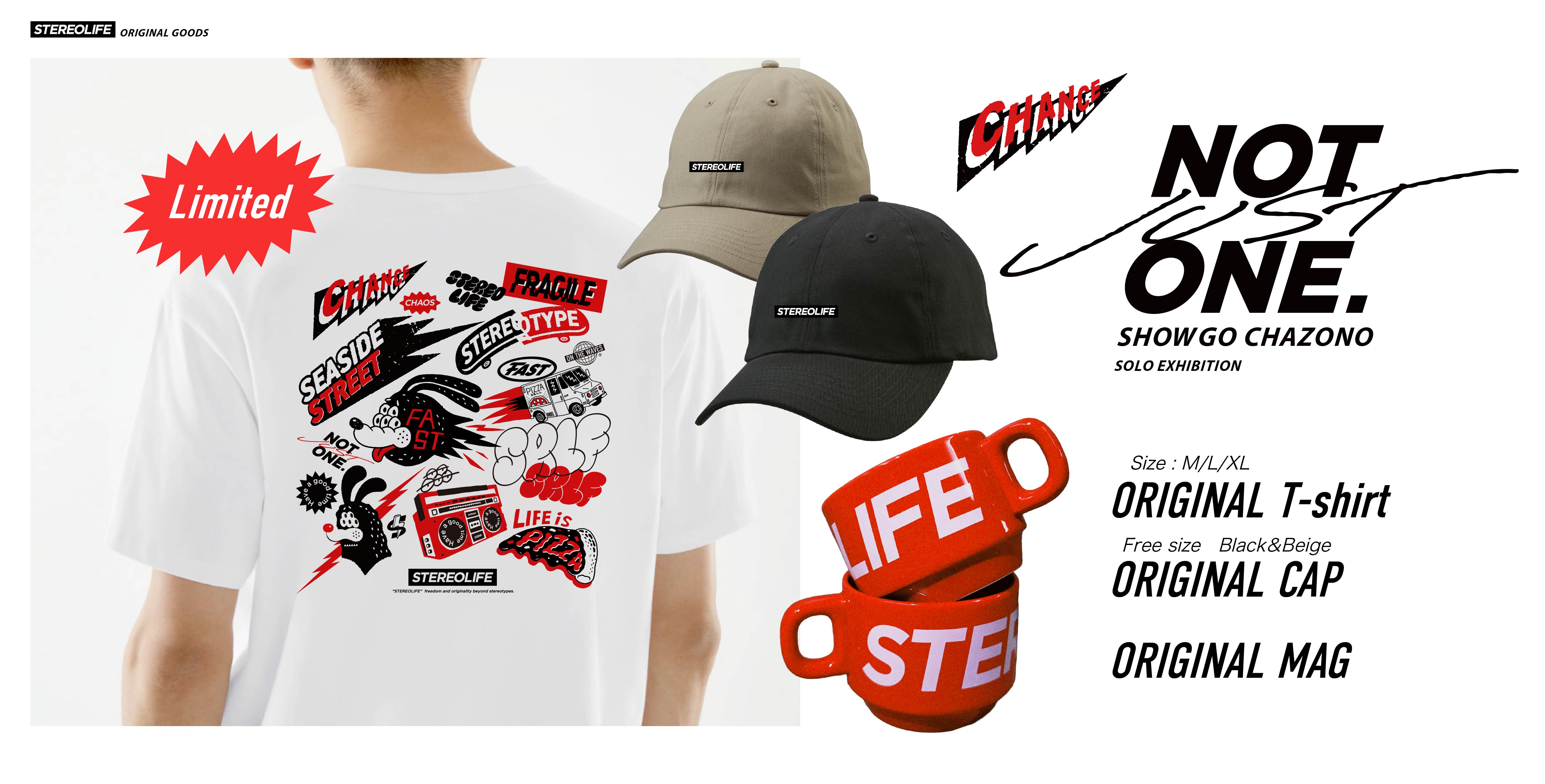 茶薗さんのアーティストブランド「STEREOLIFE」の、Tシャツや帽子などのアパレルグッズや、ステッカーやキーホルダーなどのアイテムが並びます。