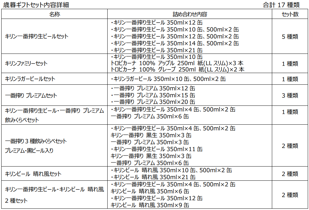 こうしたお客様動向を踏まえ、今回、「一番搾り」と「晴れ風」を中心としたラインアップを展開します。新たに「晴れ風セット(350ml×21缶)」を追加し、歳暮ギフトセットとして初めて「一番搾り」と「トロピカーナ 100%(アップル・グレープ)」を詰めた、「キリンファミリーギフト」を発売します。