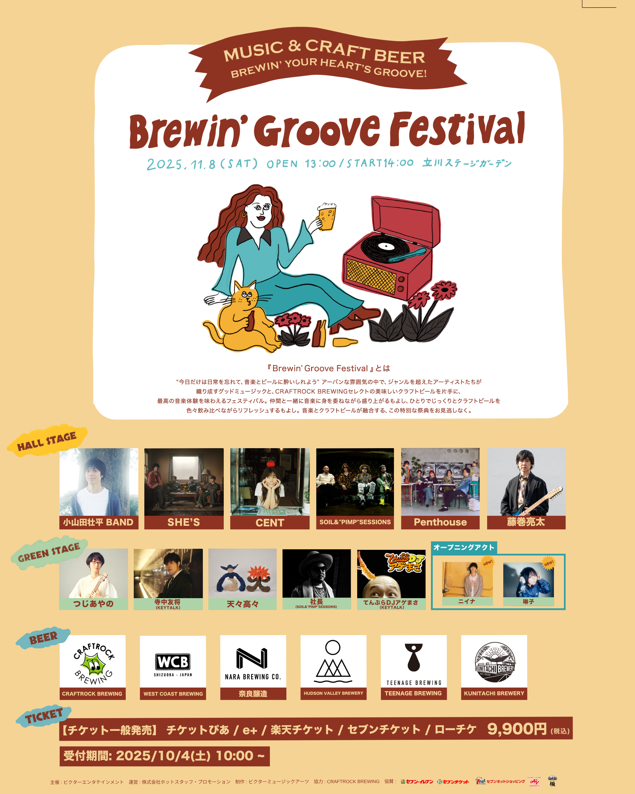 ビクターエンタテインメント株式会社(本社:東京都渋谷区、代表取締役社長:小野 朗)は、クラフトビールとグッドミュージックを楽しめる新たなフェス「Brewin’ Groove Festival」を2025年11月8日(土)立川ステージガーデンにて開催いたします。本フェスでは、ジャンルを超えたアーティストたちによるグッドミュージックと、CRAFTROCK FESTIVALを手がけるCRAFTROCK BREWINGがセレクトしたクラフトビールを片手に、極上の音楽体験を味わうことができます。