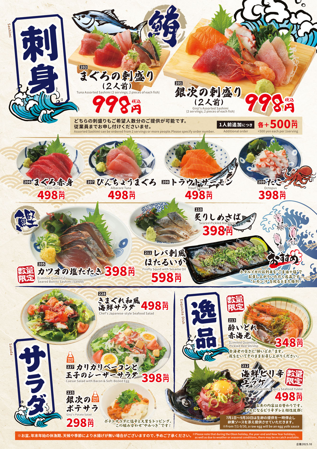 銀次の刺身定食、さしから定食、さしさば定食、焼さば定食たっぷり大根おろし添え、からさば定食、アジから定食タルタル添え