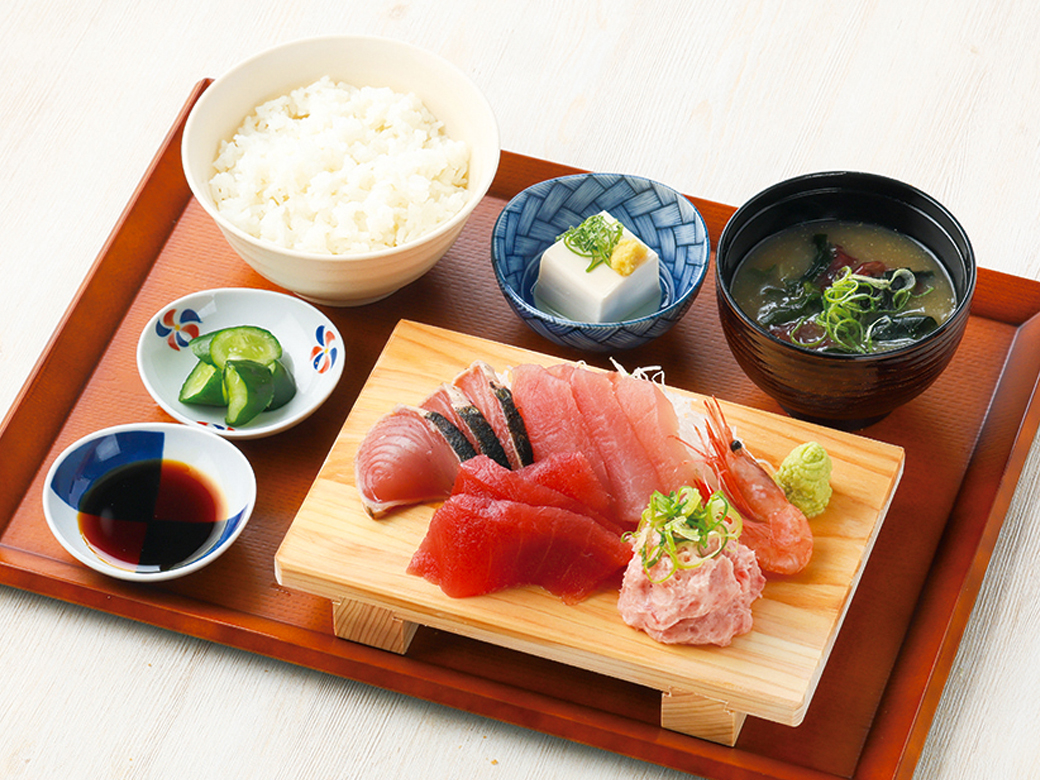 お刺身盛り合せ、ごはん、味噌汁、漬物、小鉢が付いたオトクな定食です。