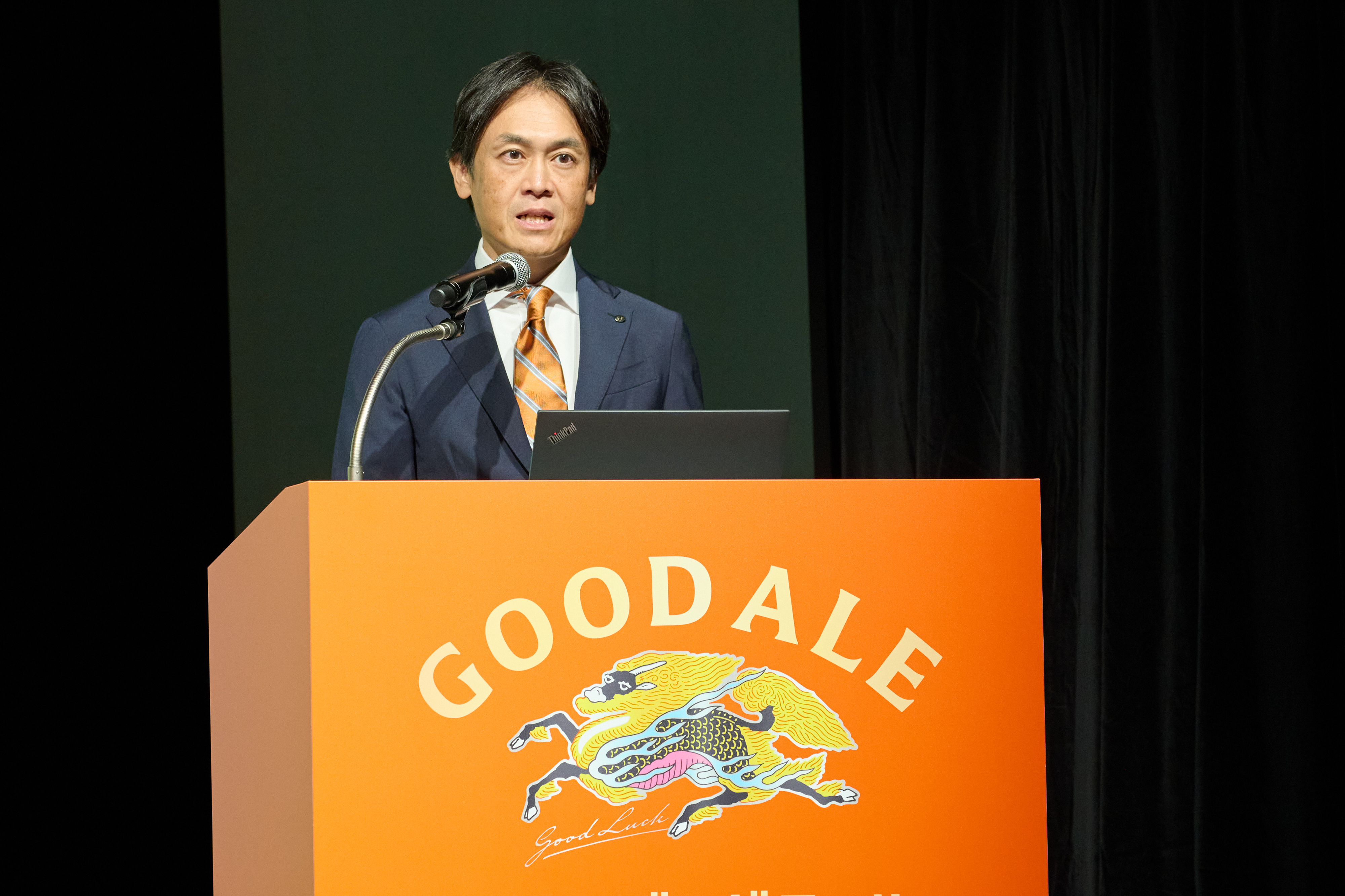 社長の堀口英樹が登壇し、新ブランド「キリングッドエール」についてプレゼンテーションを行い、「日本の未来が明るくなる、いいビールをつくりたい」という強い思いから生まれた、キリンの次世代定番ビールである意気込みを述べました。