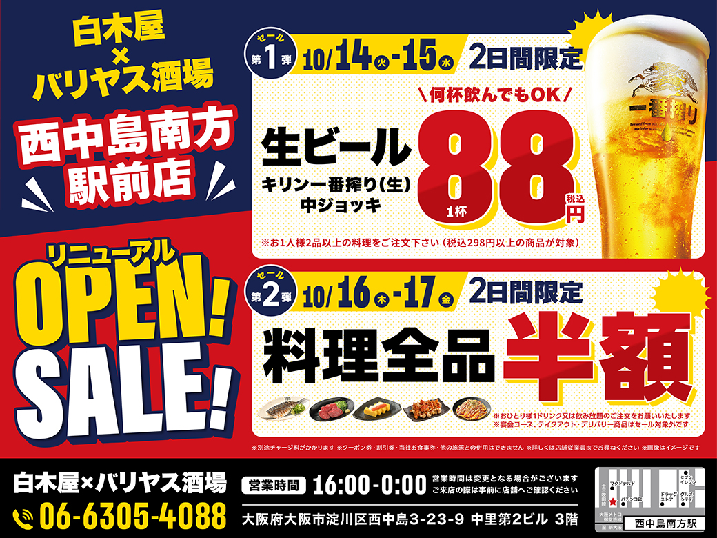 「白木屋×バリヤス酒場 西中島南方駅前店」オープン記念セール!