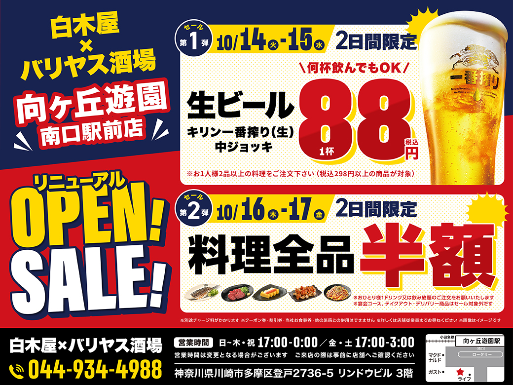 「白木屋×バリヤス酒場 向ヶ丘遊園南口駅前店」オープン記念セール!
