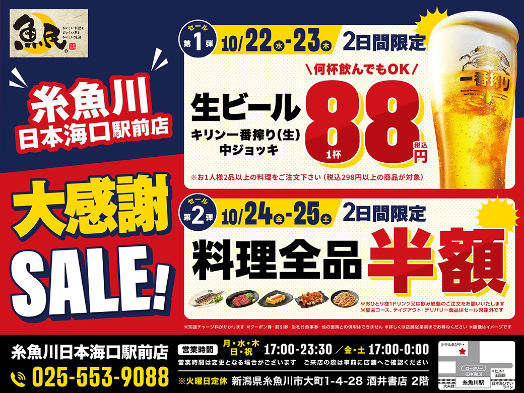 「白木屋」「魚民」「目利きの銀次」などを全国に展開する株式会社モンテローザ(本社:東京都杉並区、代表取締役:大神輝博)は、「魚民 糸魚川日本海口駅前店」において、2025年10月22日(水)から4日間の大感謝セールを開催いたします。