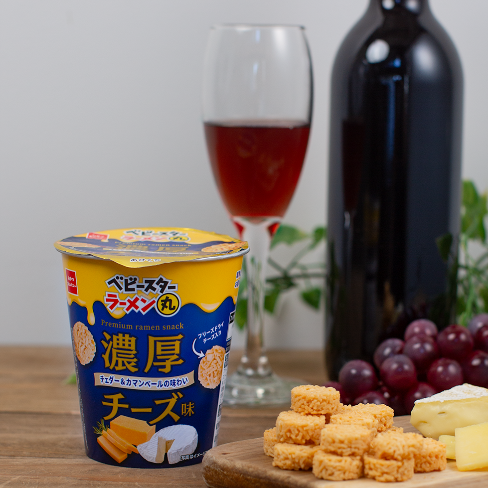 特に赤ワインとの相性が抜群!チーズの塩味・コク深い風味がワインの酸味や渋みと調和し、美味しさを引き立てます。日々の晩酌はもちろん、これからのパーティーシーズンにもぴったりな『ベビースターラーメン丸(濃厚チーズ味)』でワンランク上の晩酌時間をお愉しみください。