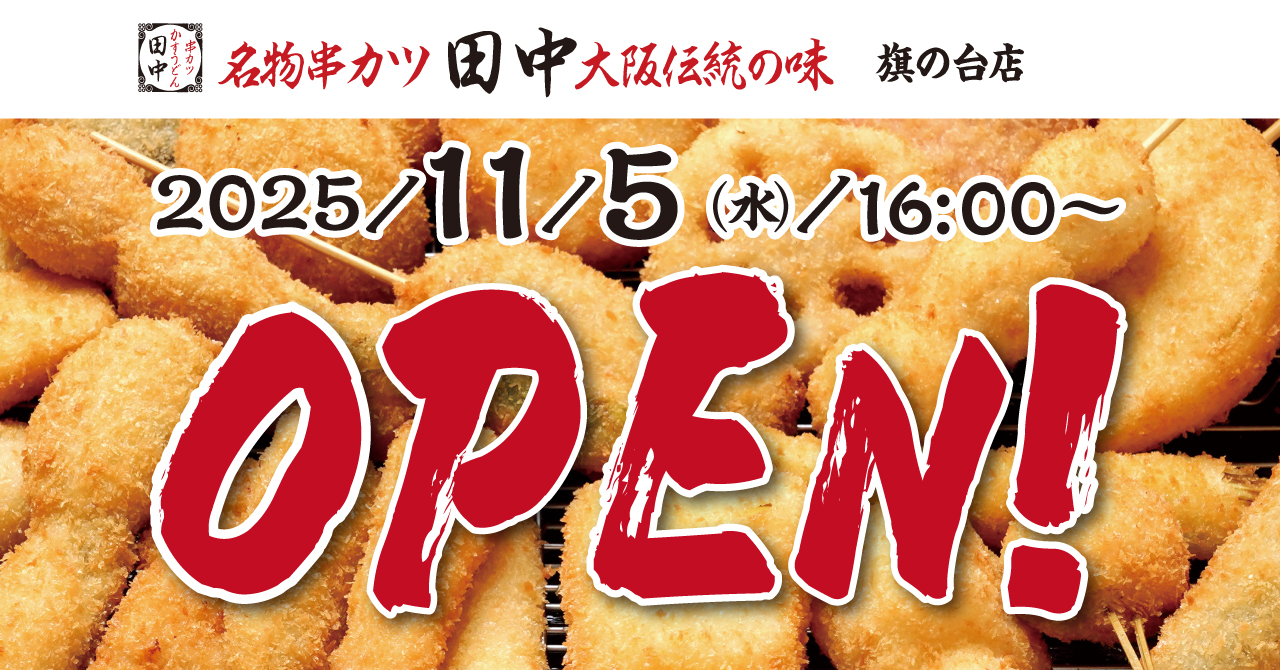 株式会社串カツ田中ホールディングス(本社:東京都品川区東五反田、代表取締役社長:坂本 壽男)の子会社である株式会社串カツ田中は、2025年11月5日(水)に「串カツ田中 旗の台店」をオープンいたします。