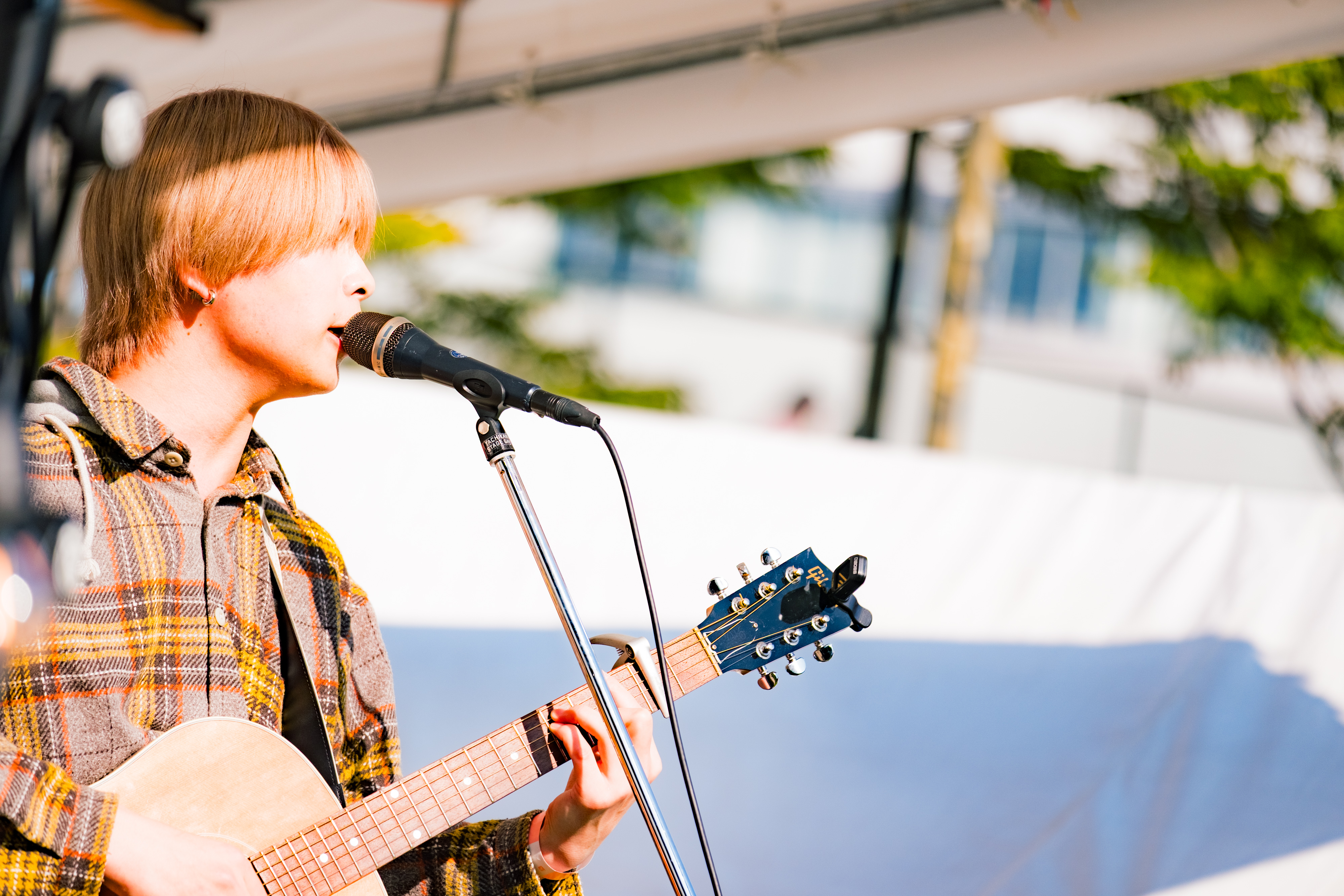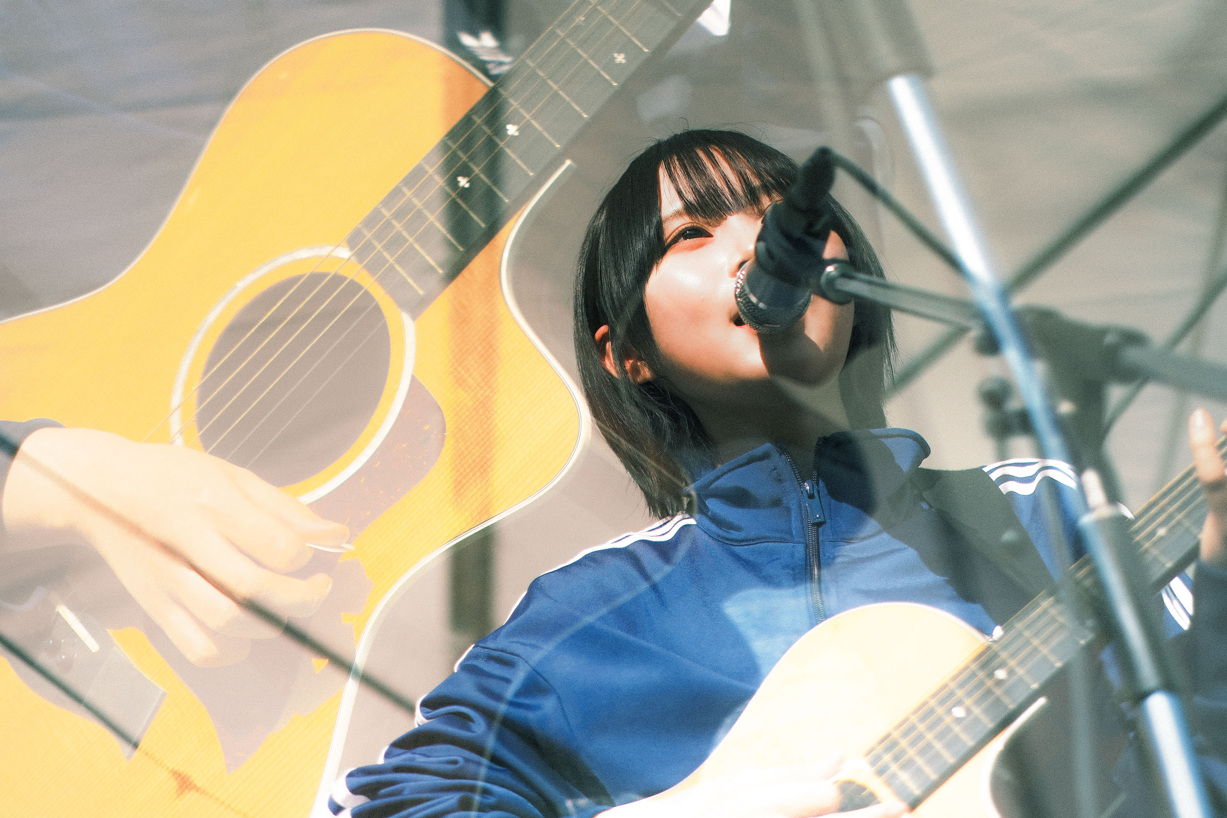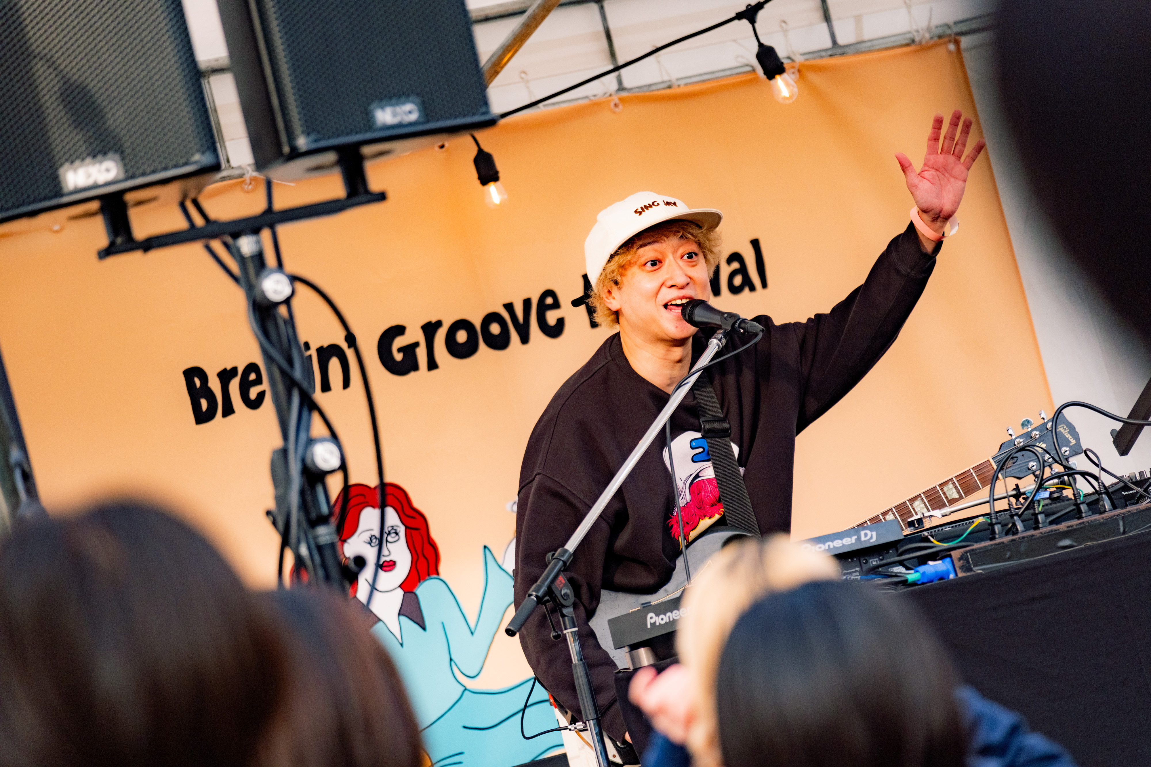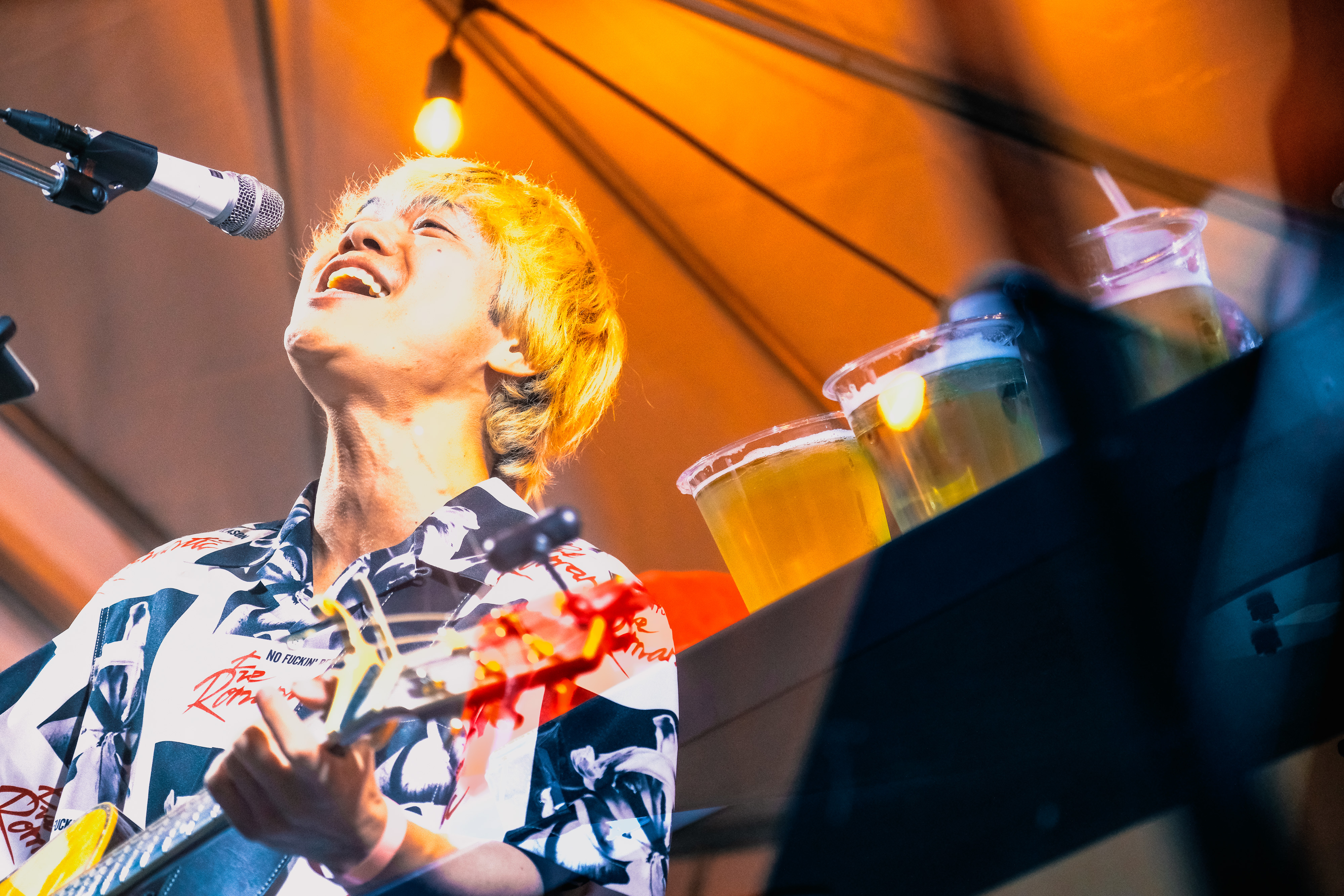 オープニングアクト2組目は、福岡出身のシンガーソングライターのニイナだ。彼が歌うのは、恋の寂しさや、思いが釣り合わない切なさ。青空に溶けるシルキーボイスで、ライブを楽しみにやってきた人はもちろん、フードの列に並ぶ人たちのことも魅了した。オリジナル曲中心のセットリストに、中学生の頃初めてギターで練習した曲だというゆず「いつか」のカバーも織り交ぜつつ、ラストには、一番大切な曲だと語りながら「花のような君でいて」を披露。美しいファルセットが響き渡った。