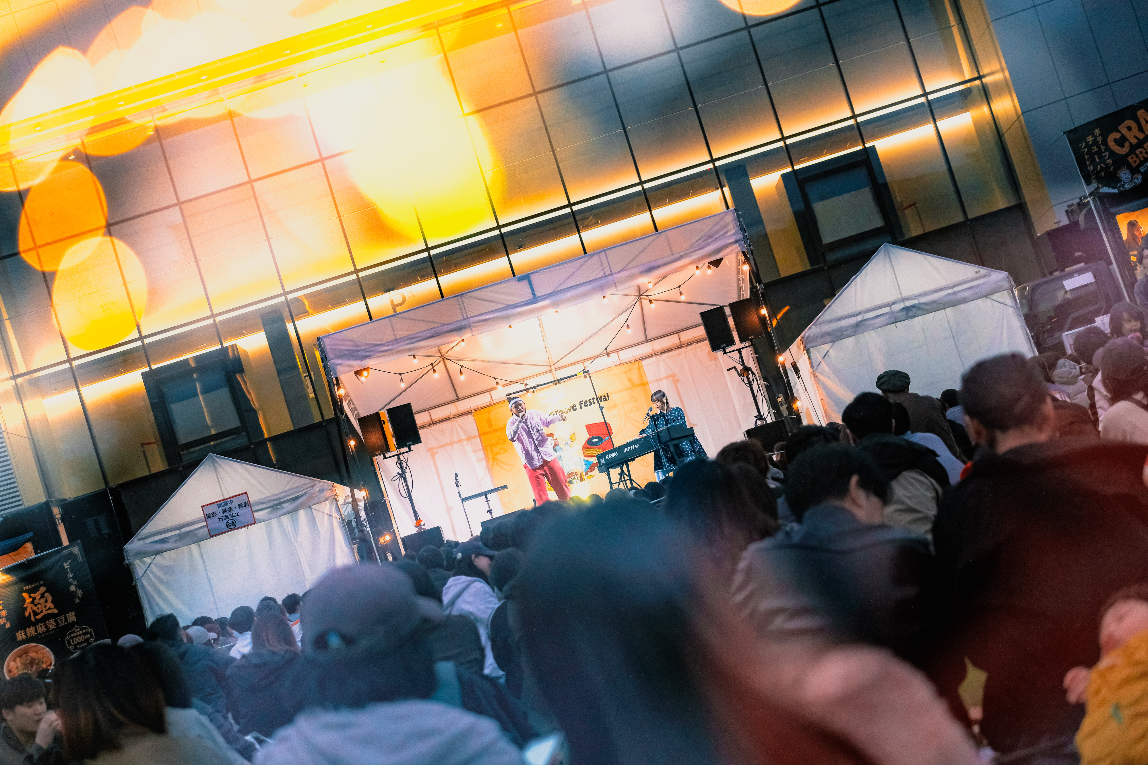 MOROHAのMCアフロ=「あふちゃん」とシンガーソングライターのヒグチアイ=「あいちゃん」のユニット、天々高々。観客の拍手に迎えられた2人は、まず、読売巨人軍が大好きな男の子に恋した女の子の歌「YG」を披露。リズミカルなピアノフレーズに乗せて、温かな歌を届けた。老若男女が集う「Brewin’ Groove Festival」だが、イベント後半に差し掛かった今、家族連れ、カップル、部活帰りの学生……と本当に様々な人の姿が見られる。そんななか、天々高々は3曲目に「壊れかけのRadio(カバー)」を披露。観客を沸かせたあと、あふちゃんは「やっぱりみんなが知ってる曲は強いな!」と笑った。そして「この中で今恋をしているよって人? 手を挙げるのは恥ずかしいと思うから、俺にだけわかるように小さく人差し指をあげてください」「ありがとう。捧げます」と届けられたのは「ロマンス」。あふちゃんによる「好きだ」のリフレインとあいちゃんのコーラスが、美しいハーモニーを織り成した。ラストは、このフェスにぴったりな「5959」。〈飲み過ぎた反省を/肴にしてもう一杯/アルコール アルコール ゴクゴク〉の合唱がフィールドにこだました。