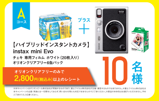 今回の「愉快爽快クリアフリー!キャンペーン」は、沖縄の行楽シーズンをより愉快に、爽快にお楽しみいただけるよう、Aコースでは「ハイブリッドインスタントカメラとオリオン クリアフリー6本」、Bコースでは「CHUMSコラボ スチールクーラーボックスとオリオン クリアフリー6本」など、外でも家でも楽しめるアイテムをご用意しました。さらに、はずれた方から抽選で60名様にえらべるPay(500円分)をプレゼントいたします。