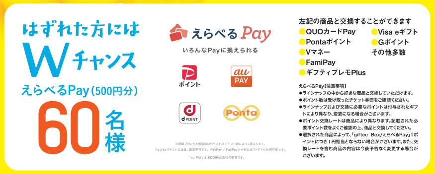 ※はずれた方から抽選で60名様にえらべるPay(500円分)プレゼントいたします。