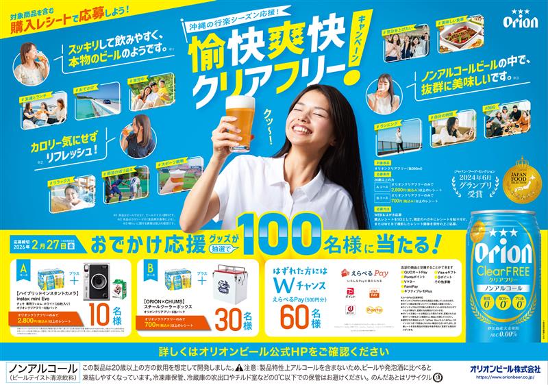 今回の「愉快爽快クリアフリー!キャンペーン」は、沖縄の行楽シーズンをより愉快に、爽快にお楽しみいただけるよう、Aコースでは「ハイブリッドインスタントカメラとオリオン クリアフリー6本」、Bコースでは「CHUMSコラボ スチールクーラーボックスとオリオン クリアフリー6本」など、外でも家でも楽しめるアイテムをご用意しました。さらに、はずれた方から抽選で60名様にえらべるPay(500円分)をプレゼントいたします。