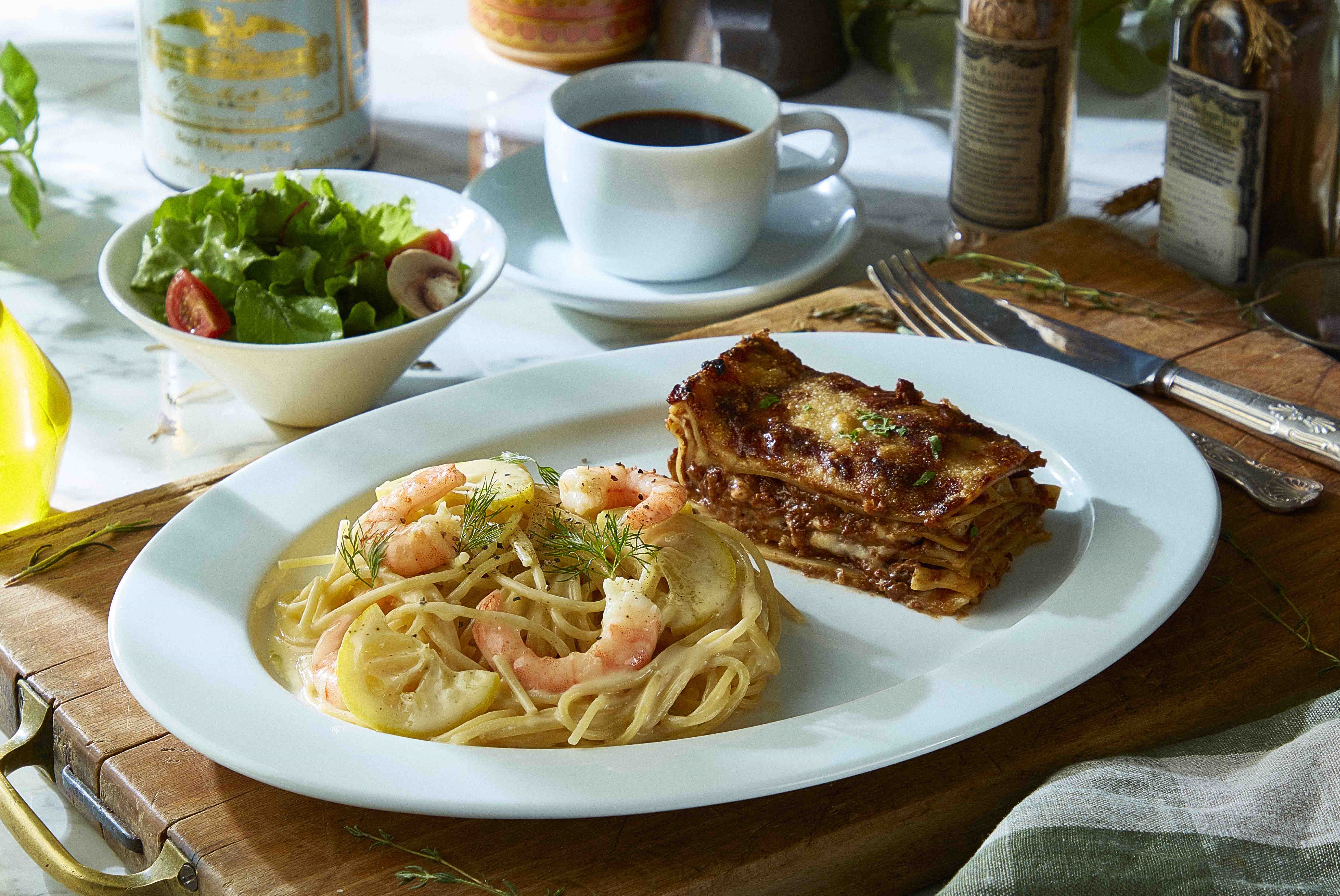 毎日お店で焼き上げるラザニアと3種からお選びいただけるパスタのセットです