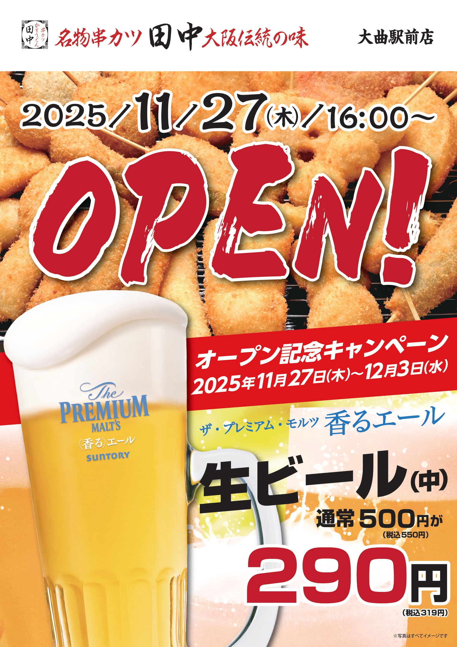 株式会社串カツ田中ホールディングス(本社:東京都品川区東五反田、代表取締役社長:坂本 壽男)の子会社である株式会社串カツ田中は、2025年11月27日(木)に秋田県2店舗目となる「串カツ田中 大曲駅前店」をオープンいたします。