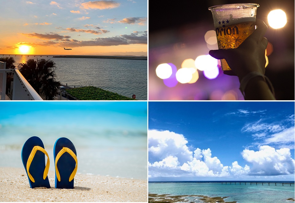 遠浅に広がる瀬長西ビーチ、水平線へと沈む夕日、夜空にきらめく星々。​