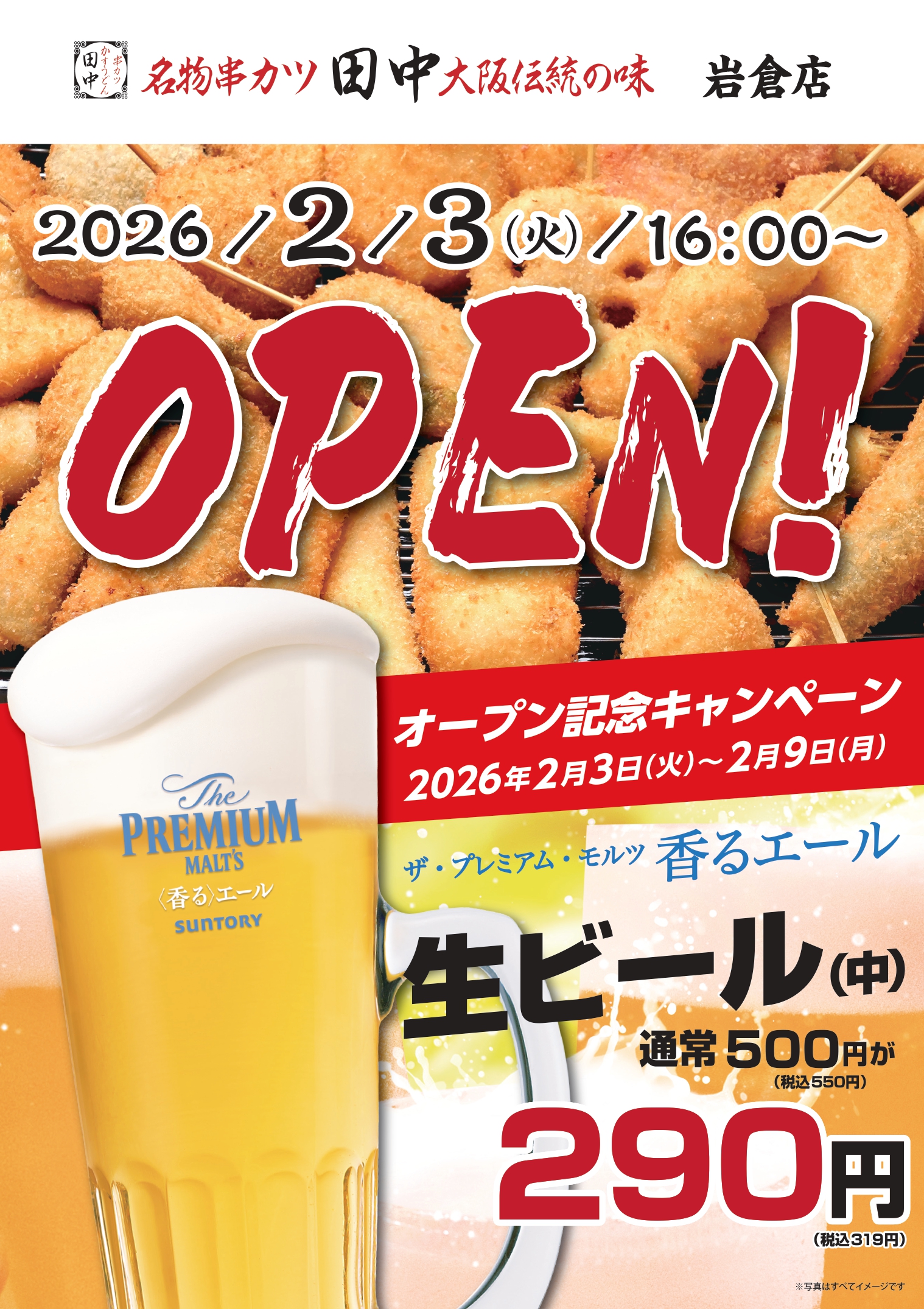 株式会社串カツ田中ホールディングス(本社:東京都品川区東五反田、代表取締役会長兼社長:貫 啓二)の子会社である株式会社串カツ田中は、2026年2月3日(火)に「串カツ田中 岩倉店」をオープンいたします。