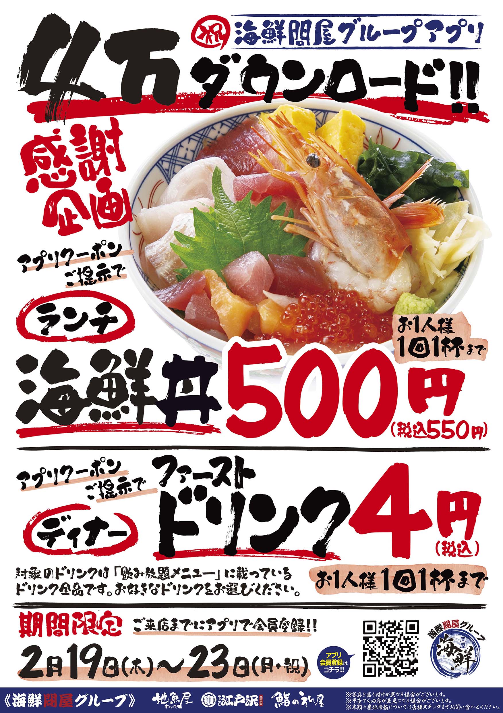 「ちゃんこ江戸沢」など、東京と埼玉の11店舗をまとめた海鮮問屋グループアプリは4万のダウンロード数を記録いたしました。このマイルストーンを記念いたしまして、2月19日(木)~ 23日(月・祝)まで感謝企画を開催いたします。ランチでは海鮮丼 500円(税込550円)、ディナーでは一杯目のドリンクを4円(税込)でご提供いたします。どちらもご注文時にアプリクーポンをご提示ください。一日につきランチで1回、ディナーで1回、合計2回までご使用できます。5日間限定のお得なイベントを是非、ご利用ください。皆様のご来店をスタッフ一同、心よりお待ちしております。