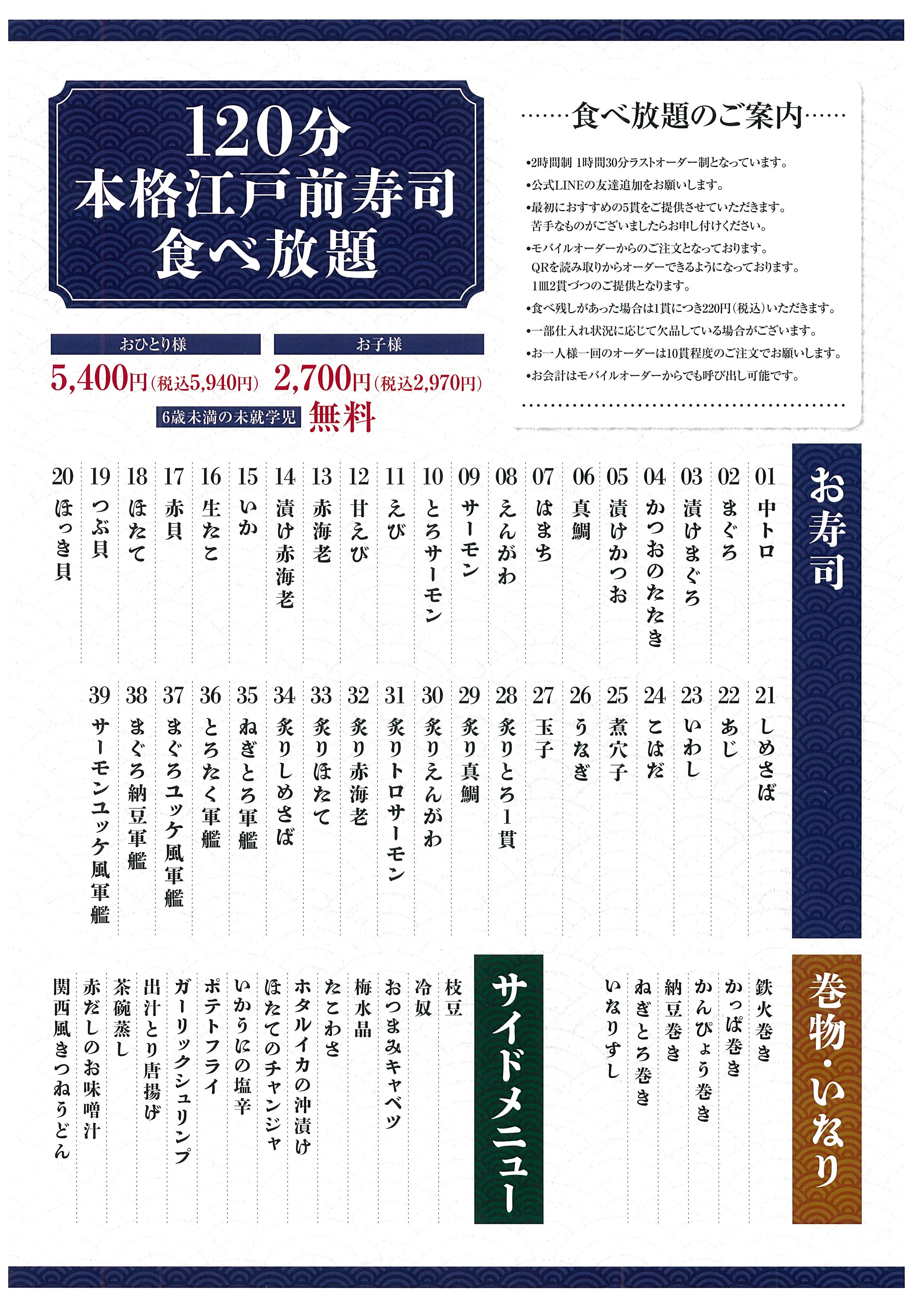 ①120分寿司+サイドメニュー&酒のあて、食べ放題コース