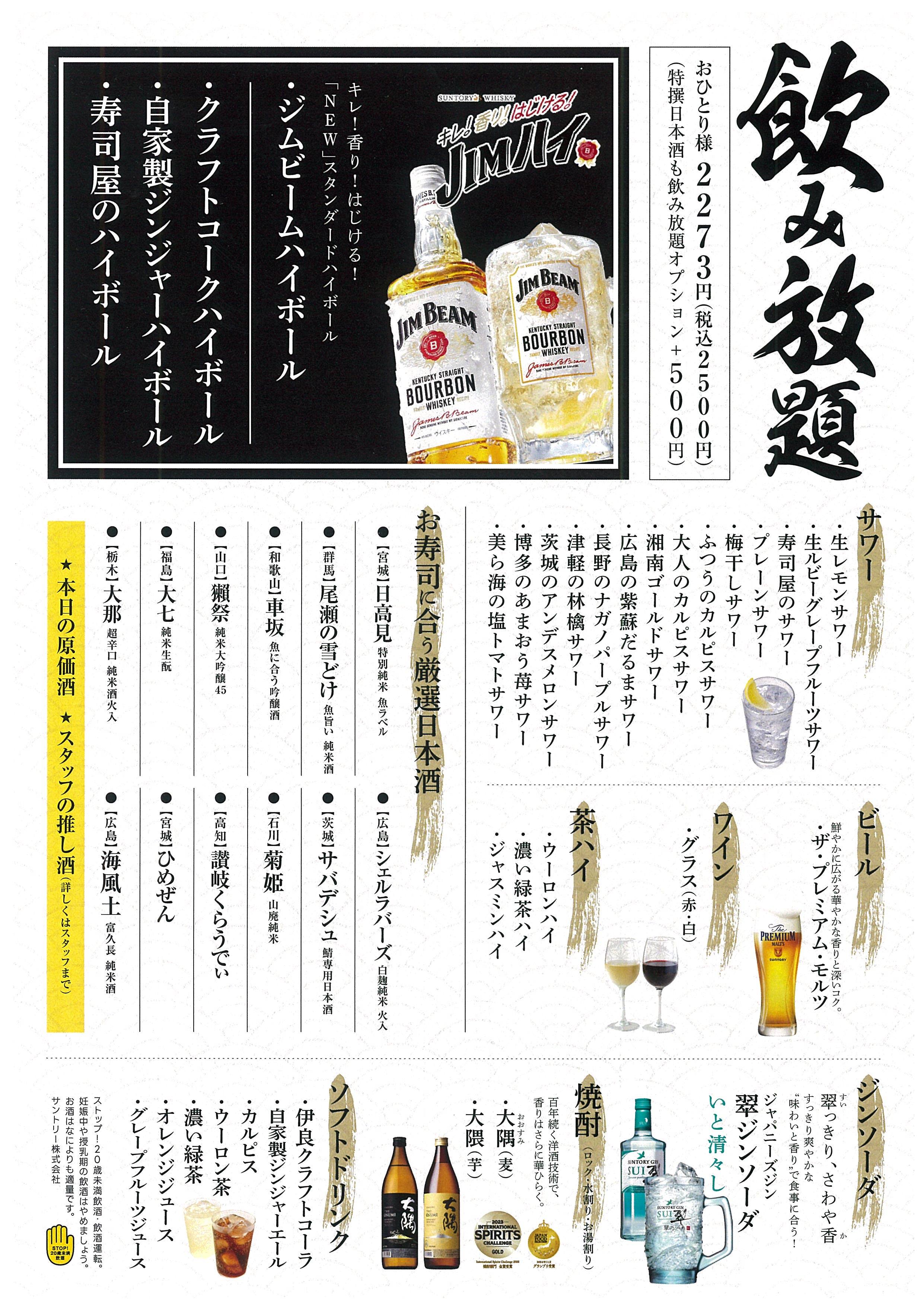 50種類の寿司+人気サイドメニューや酒のあて、の充実な食べ放題メニューに加え、人気銘柄の日本酒20種、神泡生ビールや頂点ハイボール、各種サワーやワイン、焼酎、ソフトドリンク、含んだ飲み放題も追加オプションでお楽しみいただけるプランとなっております。