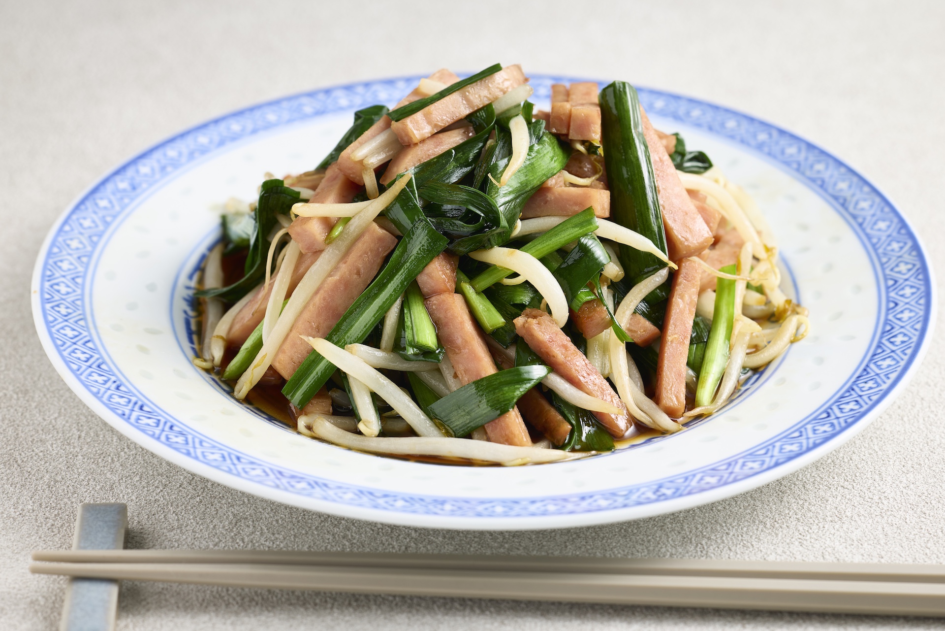 ポークとニラ、もやしを炒めるだけ