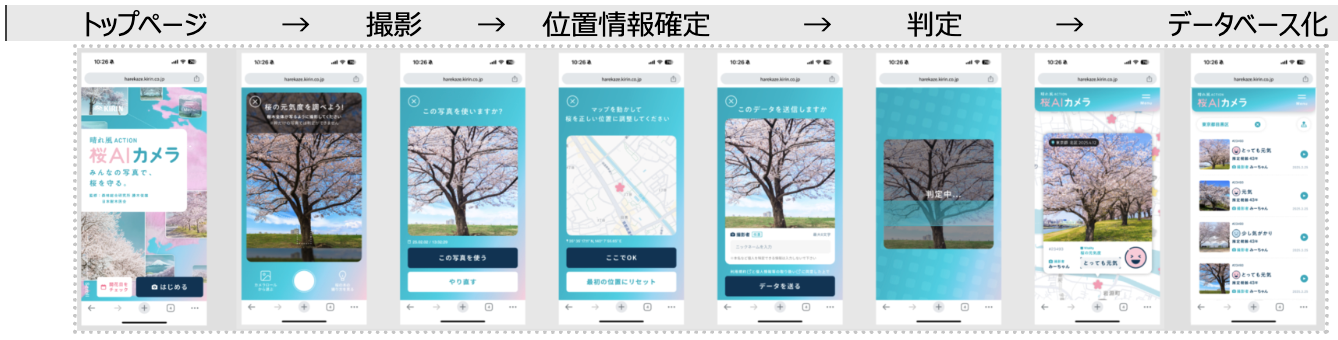 ②桜の写真と健康状態や樹齢のデータが、位置情報とともにデータベース上に集積されます。