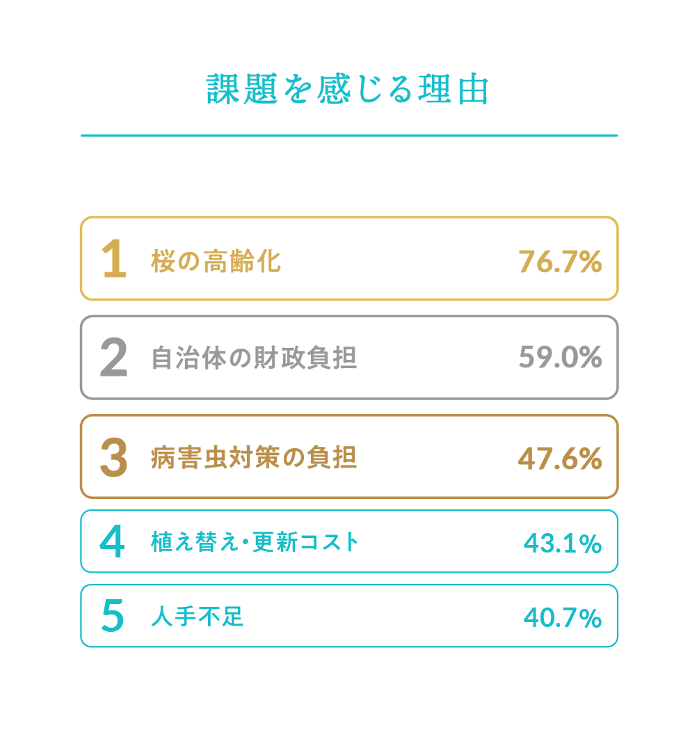 自治体の77.5%が、近年桜の管理に課題を感じていることが明らかに。課題の理由としては、「桜の高齢化」(76.7%)が最も多く、次いで「自治体の財政負担」(59.0%)、「病害虫対策の負担」(47.6%)、「植え替え・更新コスト」(43.1%)が上位に。桜の高齢化が、管理負担の増大を引き起こしている実態が浮き彫りとなった。