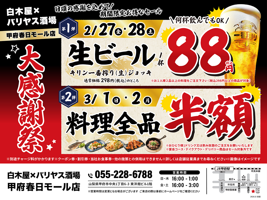 【大感謝祭】山梨県の「白木屋×バリヤス酒場 甲府春日モール店」で日頃の感謝を込めて“大感謝セール”を開催します!生ビール1杯88円(税込)セールや料理全品半額セールを日替わりで実施!