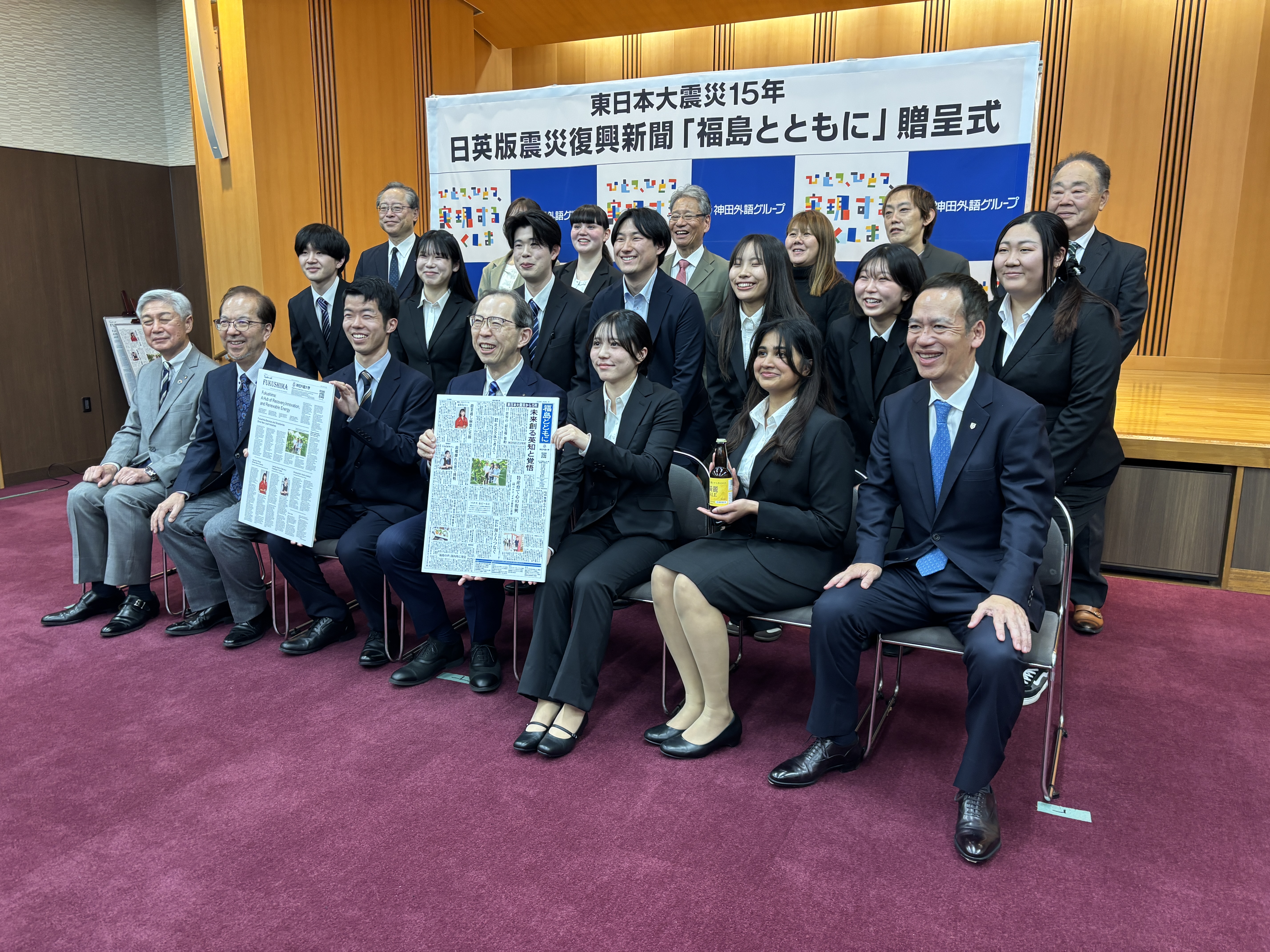 神田外語グループ(東京都千代田区/理事長:佐野元泰)は、東日本大震災・原子力災害から15年の節目にあたり、福島の復興と学生の学びを世界に発信する「震災復興発信プロジェクト」を展開しています。その一環として、グローバル人材の育成を目指す神田外語大学・柴田真一ゼミの学生19名が、福島県浜通り地域での取材をもとに、日英版の震災復興新聞『福島とともに(英題:”Together with Fukushima”)』を完成させました。このたび完成した本紙を、2026年3月4日(水)に復興庁へ贈呈する予定です。あわせて、同プロジェクトの成果物の一つとして制作した震災復興ビールも贈呈します。本贈呈式は、学生による取材と学びの成果を、復興大臣へ届ける機会として実施します。
