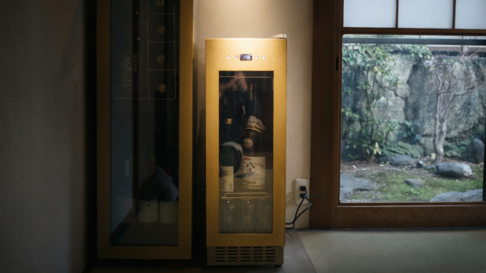 一升瓶にも対応する高さ83cmのコンパクト設計。日本の四季に合わせた精密温度管理で、晩酌時間をより豊かに。