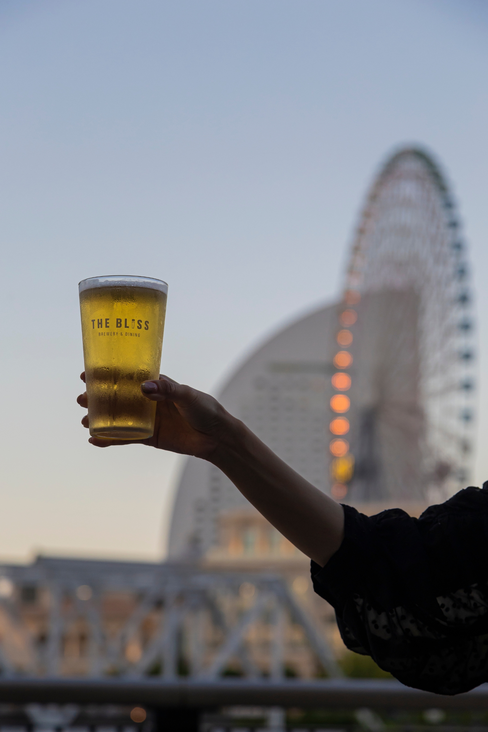 夕暮れへと移ろう横浜みなとみらいの景色を眺めながら、クラフトビールをゆったりと楽しめます。