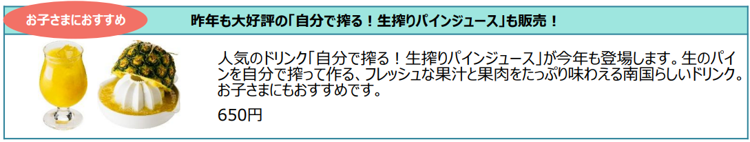 ■お子さまにもおすすめ!昨年大好評の「自分で搾る!生搾りパインジュース」を今年も販売。