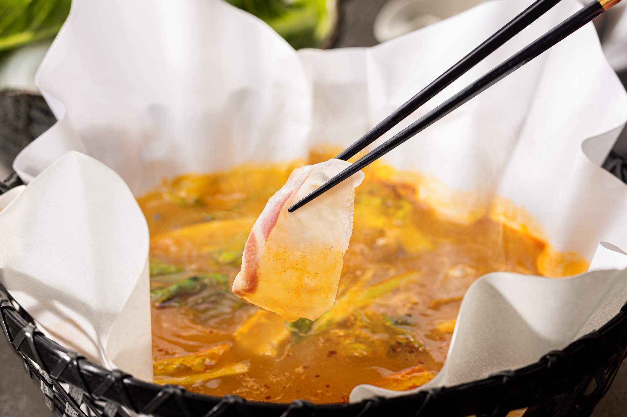 【瀬戸内産真鯛のトムヤムクン鍋】瀬戸内海で獲れた真鯛を、爽やかな酸味と辛味が特徴のトムヤムクン仕立ての出汁で味わう鍋料理。真鯛の甘みとスパイシーな風味の組み合わせが食欲をそそります。