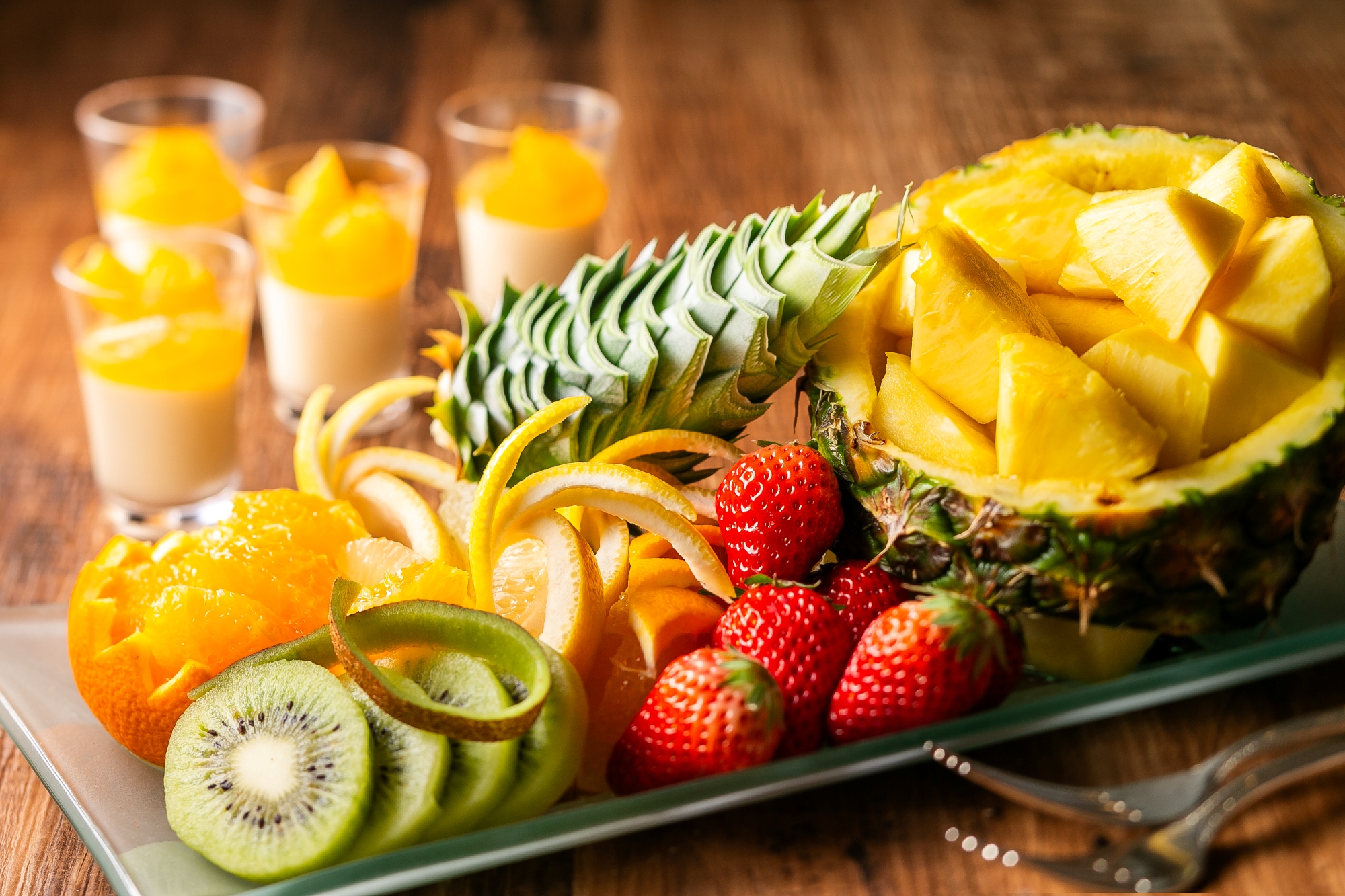 夏のオードブル ヴァリエプレート(お一人様一皿)オリジナルトラウトサーモン・県産食材の肴・県産野菜ピクルス/赤海老のカルパッチョ 県産野菜とともに/蝦夷アワビの殻焼き カッペリーニ・ジェノベーゼ/スペイン産生ハムとチーズのルーレ 香味野菜ソース/広島県産野菜のサラダバー3種のドレッシングで/ムール貝と県産野菜 アンチョビアヒージョ/赤魚のポワレ 県産じゃがいものマッシュポテト焼き 瀬戸田産レモンの香り/オリジナルハンバーグ/若鶏の衣焼き 県産野菜のサルサソース/自家製スペアリブ/バケットのチーズ焼き/神戸ハイカレー サフランライス添え/安芸津ポテトの肉じゃが風/フルーツ盛り合わせとデザート盛り合わせ
