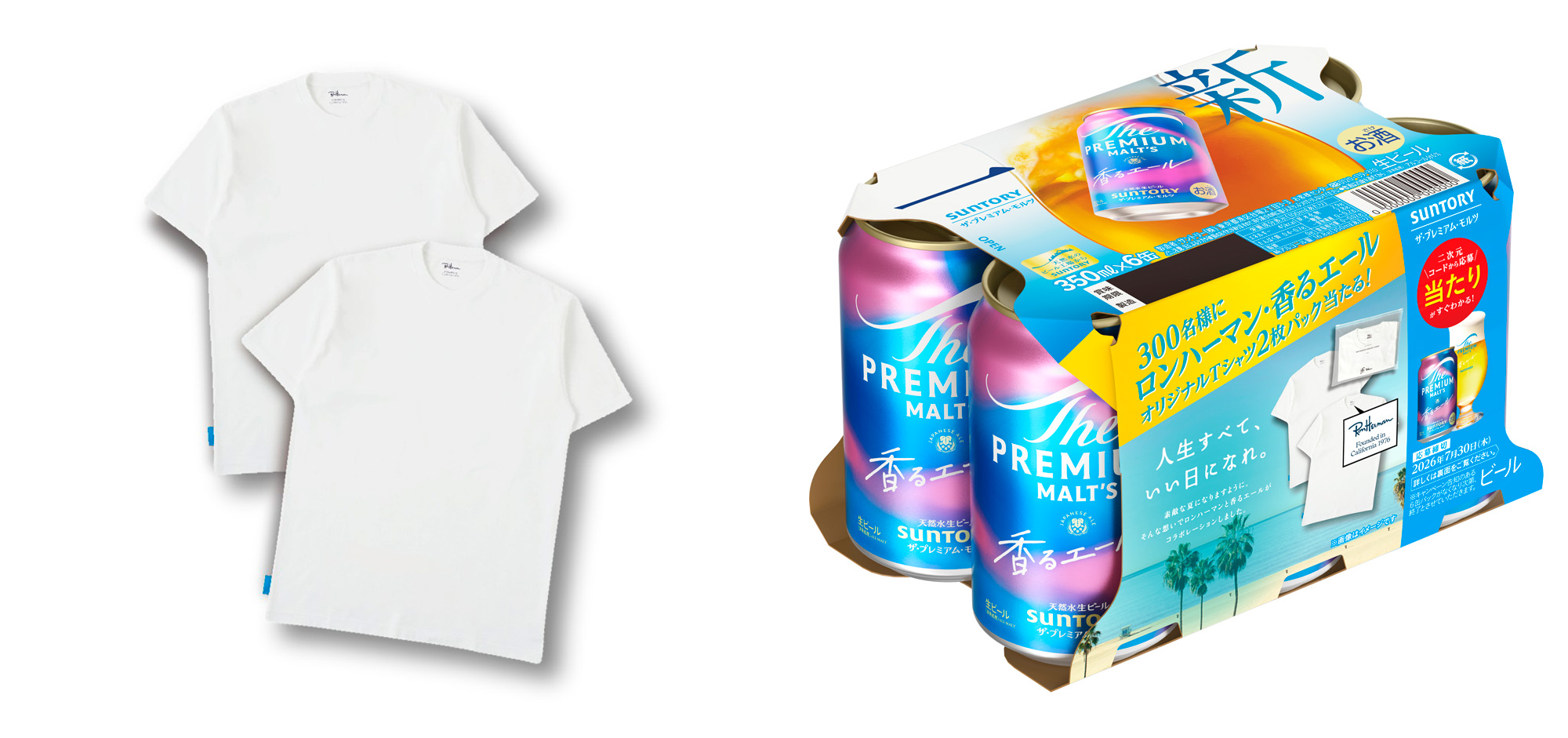 限定デザインの「ザ・プレミアム・モルツ 〈ジャパニーズエール〉香るエール」6缶パックをご購入いただくことで、抽選で300名様に「ロンハーマン」×「香るエール」オリジナルTシャツ2枚パックが当たるキャンペーンを5月19日(火)から7月30日(木)まで実施します。詳細はキャンペーンサイトをご確認ください。