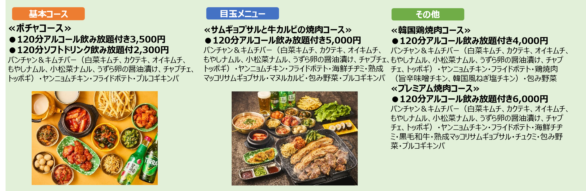 店名の通り「韓国酒場」をイメージしたビアガーデンが登場。韓国の屋台文化「ポチャ」を思わせるメニューや内装を取り入れ、モダンとレトロが融合した新しい韓国酒場の空間を演出します。全コースでは韓国総菜の「パンチャン」や「キムチバー」を食べ放題でご用意。BBQメニューのほか、豊富なおつまみメニューも取り揃え、食事としてはもちろん、お酒を気軽に楽しむ酒場としても楽しめます。